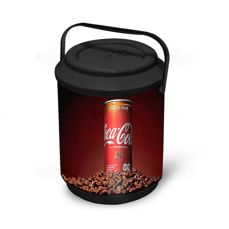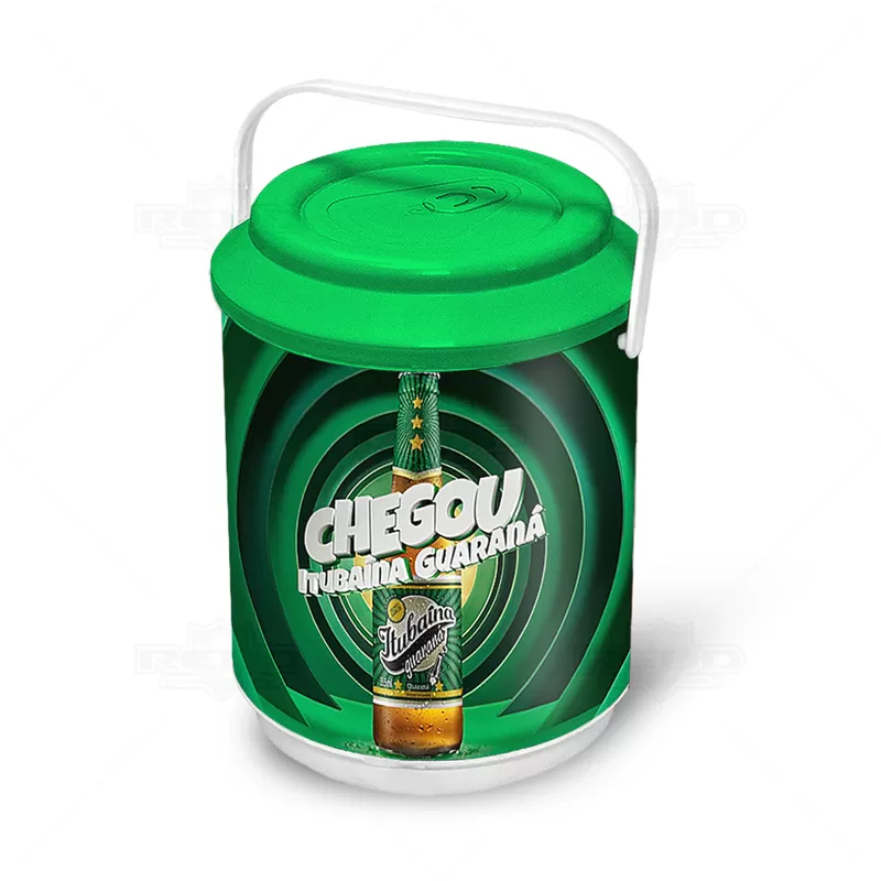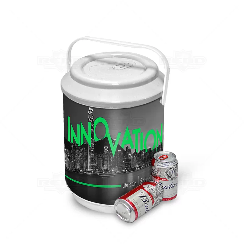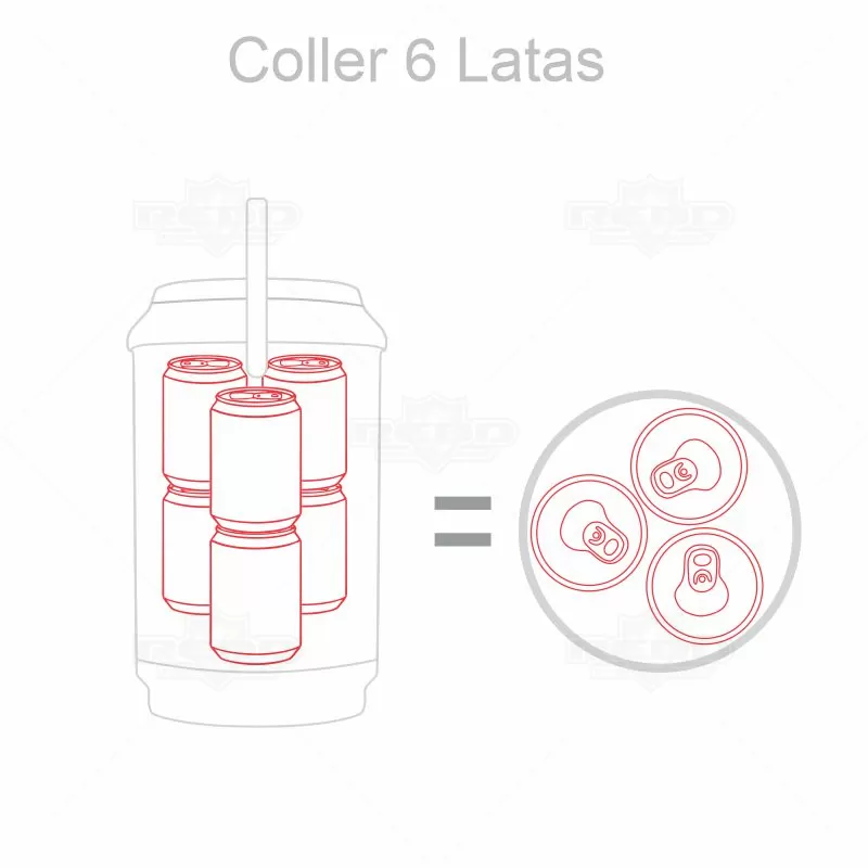 Cooler térmico personalizado em formato lata de cerveja com capacidade para 6 latas. Possui alças para transporte e tampa vedante que mantém sua bebida gelada por mais tempo. A partir de 100 pçs é possível produzir o cooler com cores de tampa e corpo colorido, para quantidades inferiores os produtos deverão se limitar as cores branco, preto ou cinza. Obs: A disposição das latas deverá ser distribuídas em 2 fileiras de 3 latas empilhadas verticalmente para depois ser completado com gelo. Objetos decorativos não acompanham o produto. Ideal para brindes personalizados e eventos corporativos.