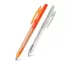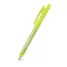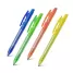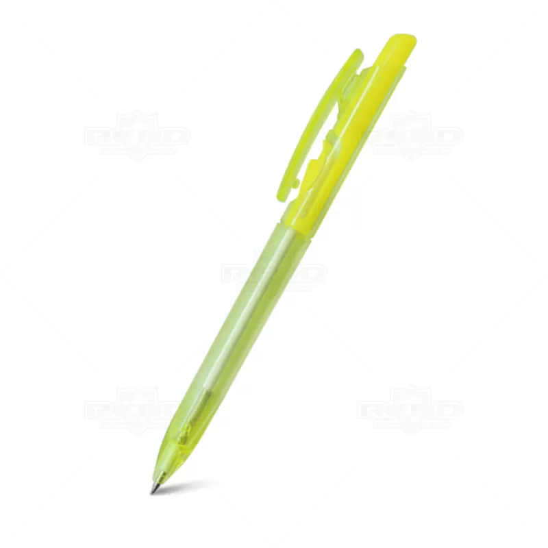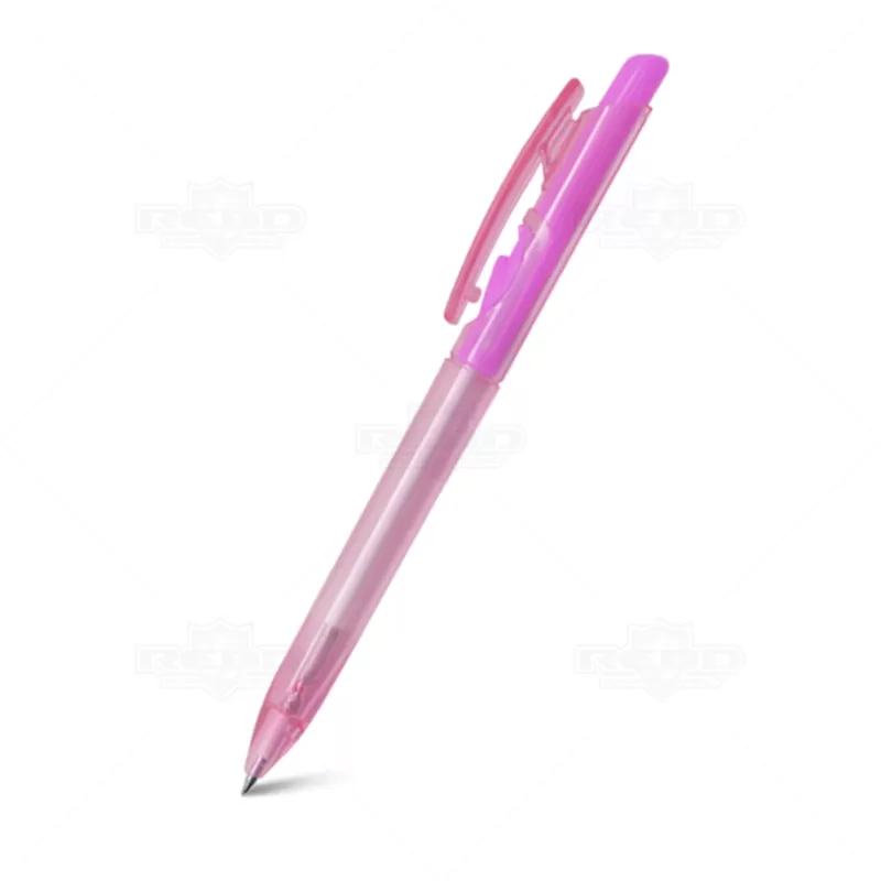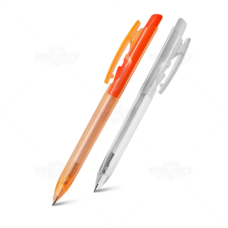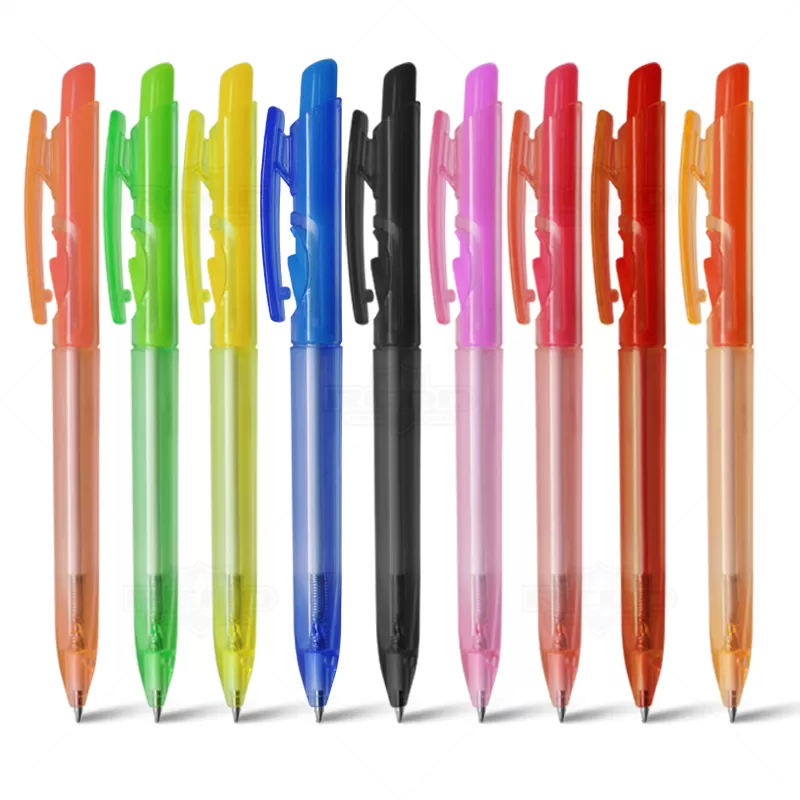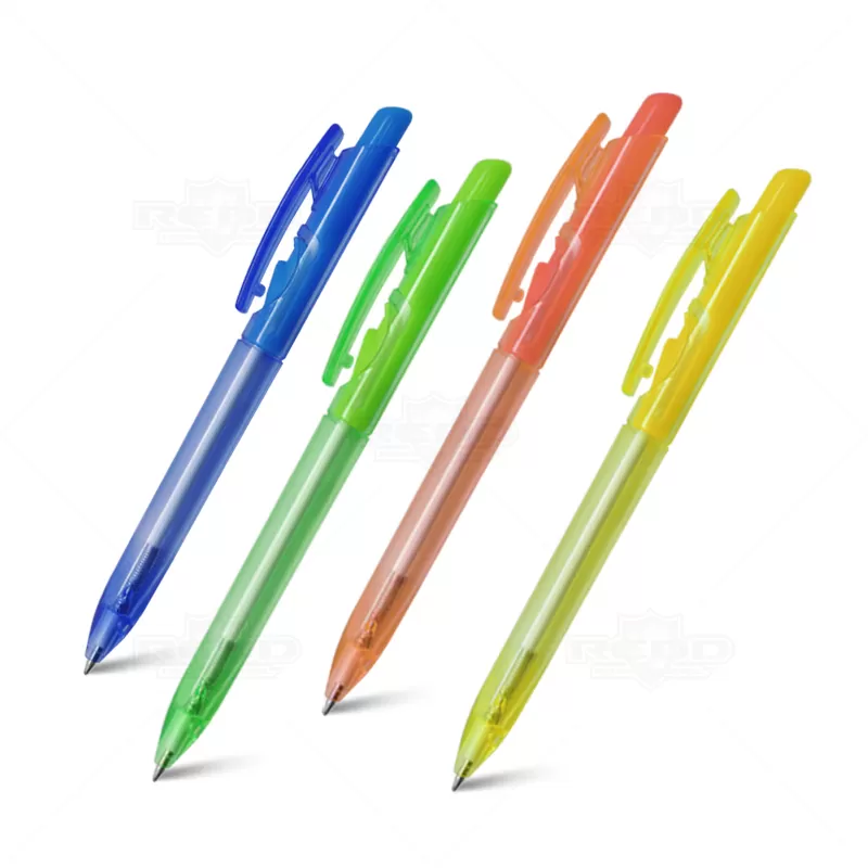 Caneta plástica personalizada com clip injetado, click colorido, corpo translúcido, acionamento da ponteira por click e escrita na cor azul. Ideal para brindes promocionais e eventos corporativos.