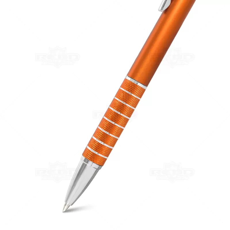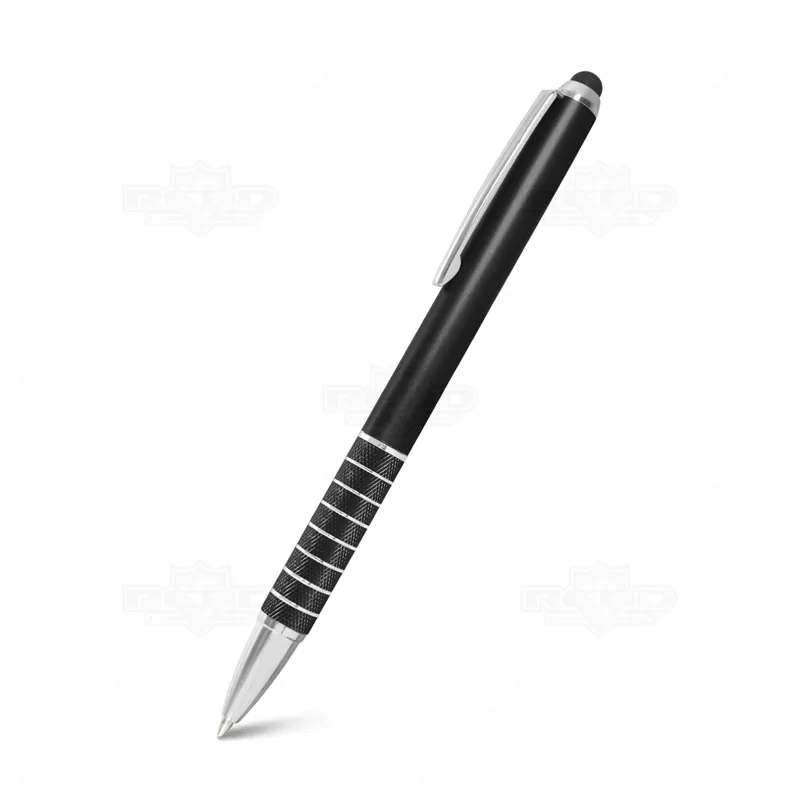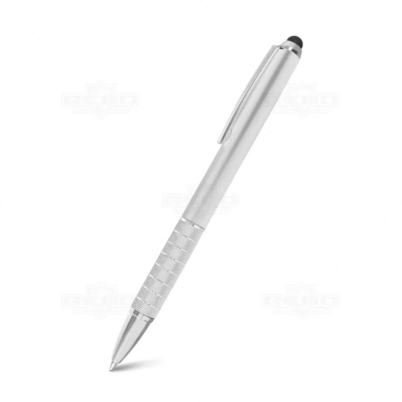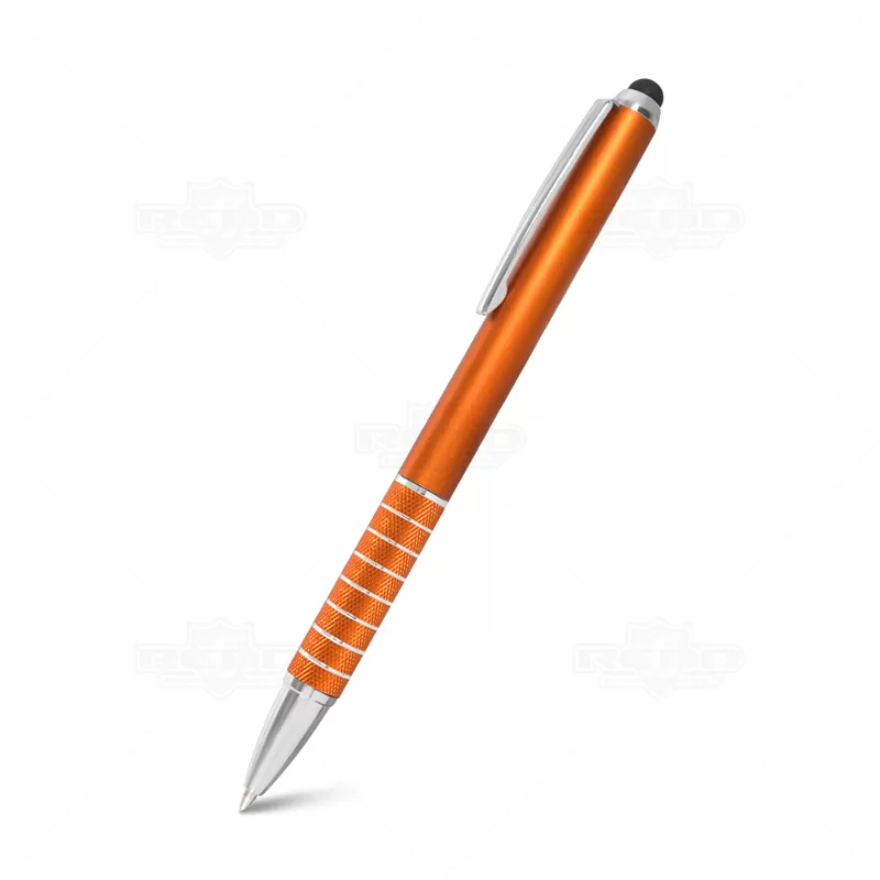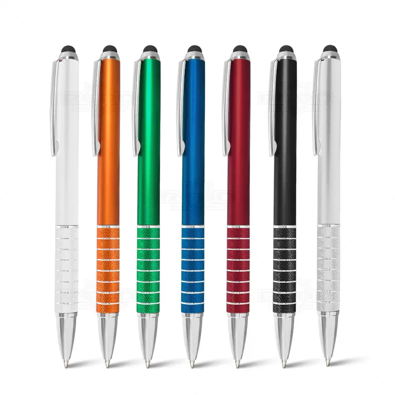 Caneta esferográfica plástica com ponteira touch e acionamento giratório. Ideal para manusear smartphones e tablets.