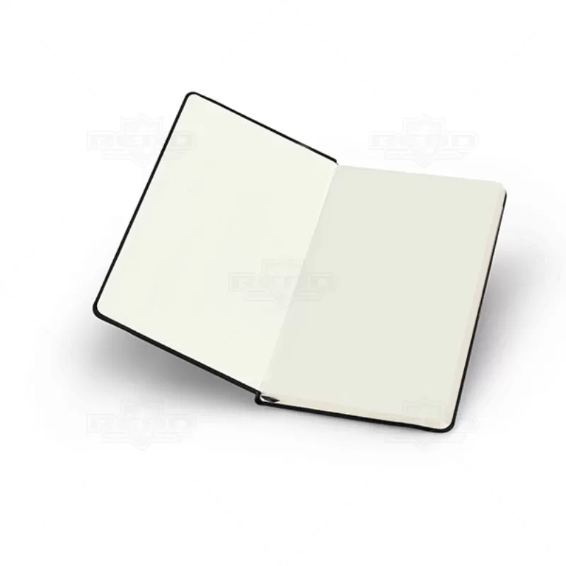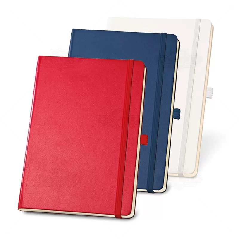 Bloco de anotações personalizado com capa dura, porta caneta (não inclusa), bolso interior e aproximadamente 80 folhas não pautadas na cor marfim. Ideal para brindes promocionais e eventos corporativos.