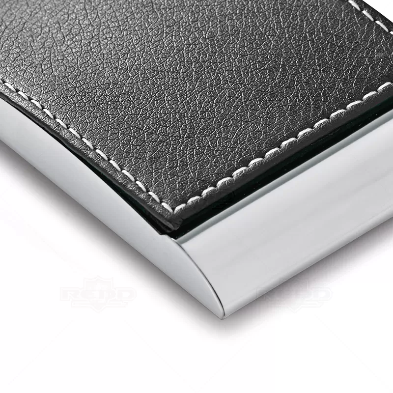 Porta cartão em material sintético personalizado com detalhe em metal, Possui compartimento para cartões e tampa articulada. Ideal para divulgar sua empresa em eventos corporativos, brindes personalizados e campanhas promocionais. Objetos decorativos não acompanham o produto.