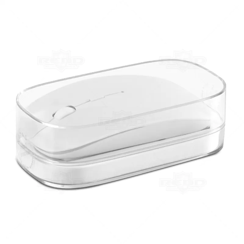 Mouse wireless 2.4G personalizado. Inclui 2 pilhas AAA. Em caixa transparente 6,3 x 11,5 x 3,0 cm. Disponível nas cores preta ou branca.