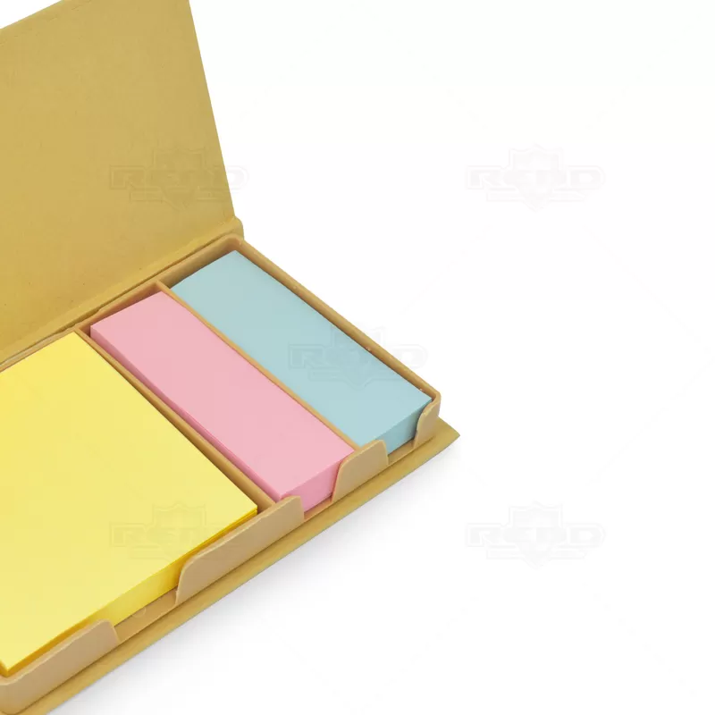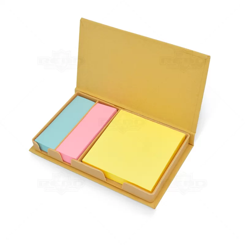Bloco de anotações personalizado com 1 bloco de autocolantes amarelo (7,5 x 7,5 cm) e 2 blocos de autocolantes coloridos (7,5 x 2,5 cm). Ambos com aproximadamente 100 páginas. Ideal para anotações diárias brindes promocionais e eventos corporativos.
