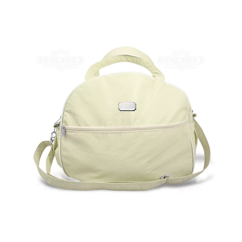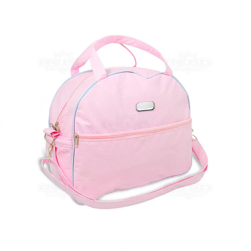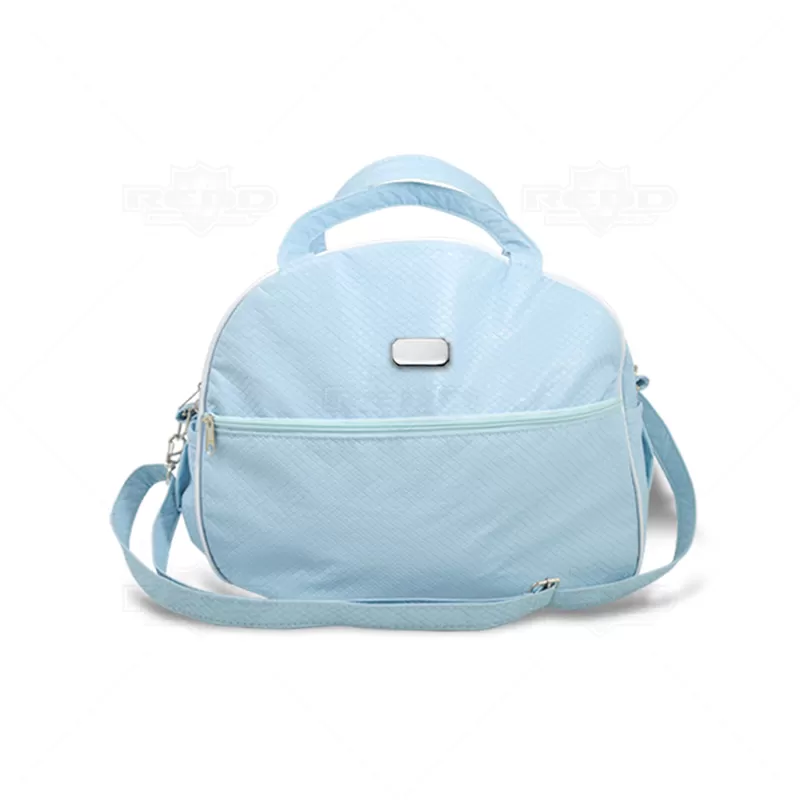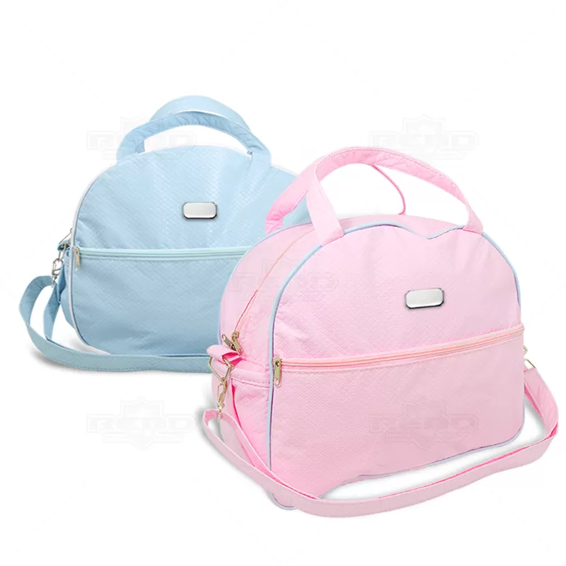 Bolsa de bebê personalizada produzida em nylon sintético com acabamento texturizado. Possui alças ajustáveis removível, dois bolsos laterais e um bolso frontal com fechamento em zíper. Ideal para pós maternidade.