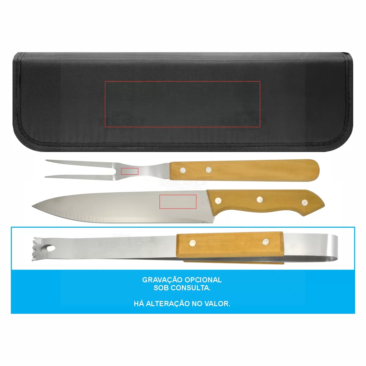 Kit churrasco com gravação personalizada. Contém: * 1 Faca * 1 Garfo Trinchante * 1 Pegador. Acompanha estojo resistente com zíper.