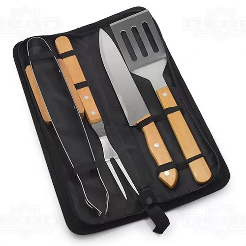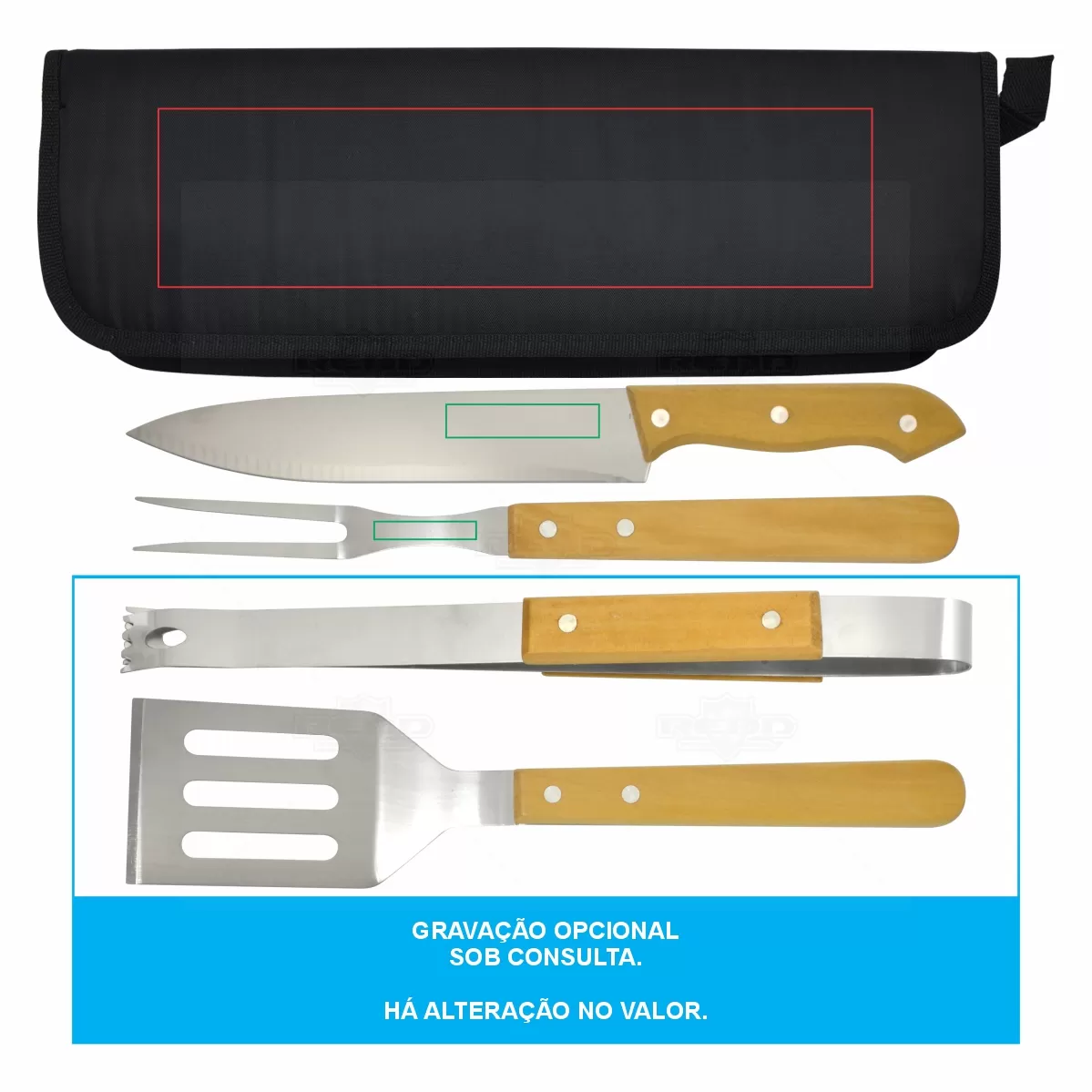 Kit churrasco com gravação personalizada. Contém: * 1 Faca * 1 Garfo Trinchante * 1 Pegador * 1 Espatula. Acompanha estojo resistente com zíper.