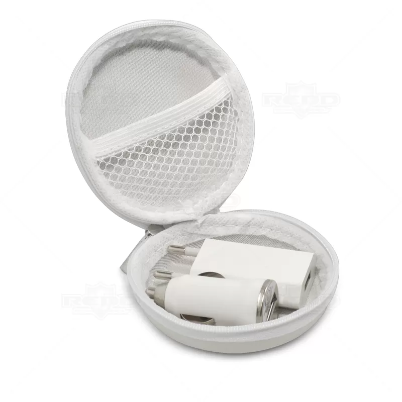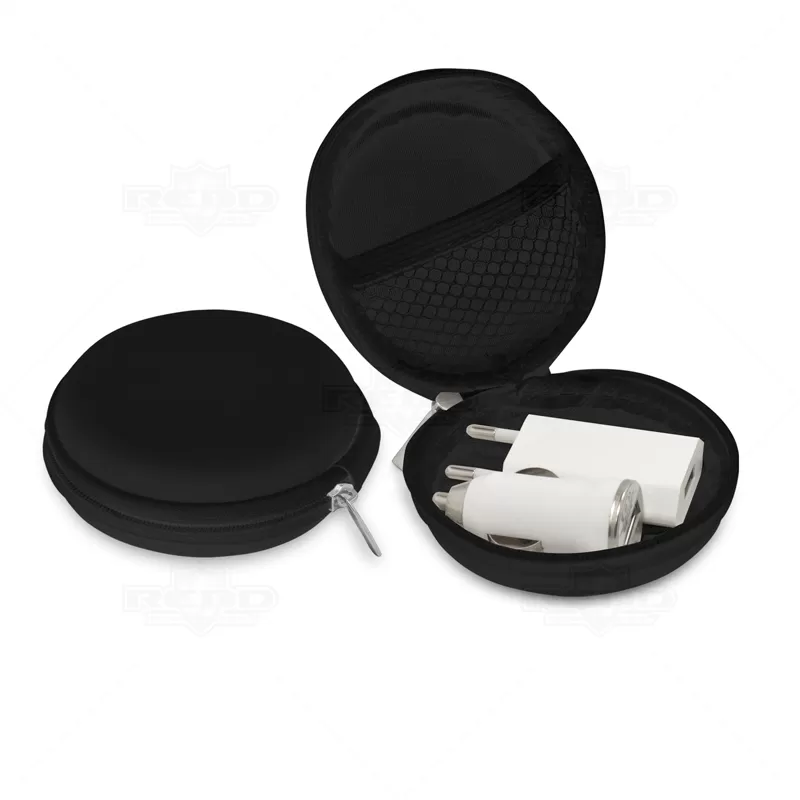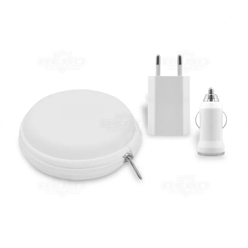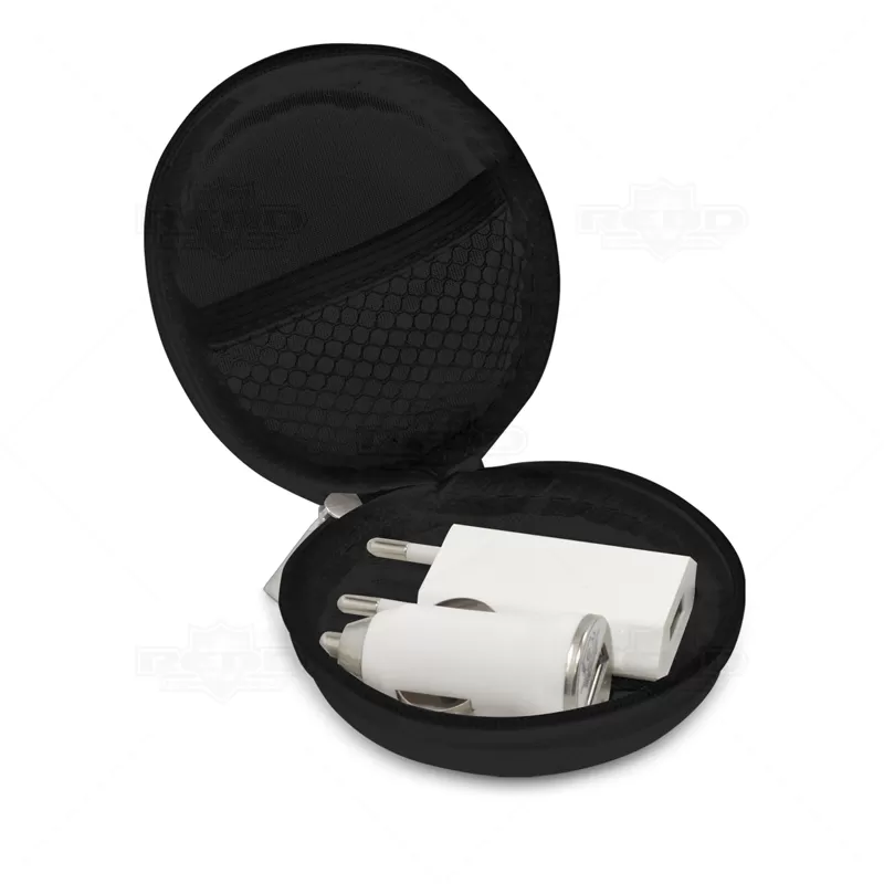 Kit portátil com estojo em E.V.A rígido com 1 Adaptador veicular e 1 Adaptador para tomada com saída USB. Ideal para divulgar sua empresa em eventos corporativos, brindes personalizados e campanhas promocionais.