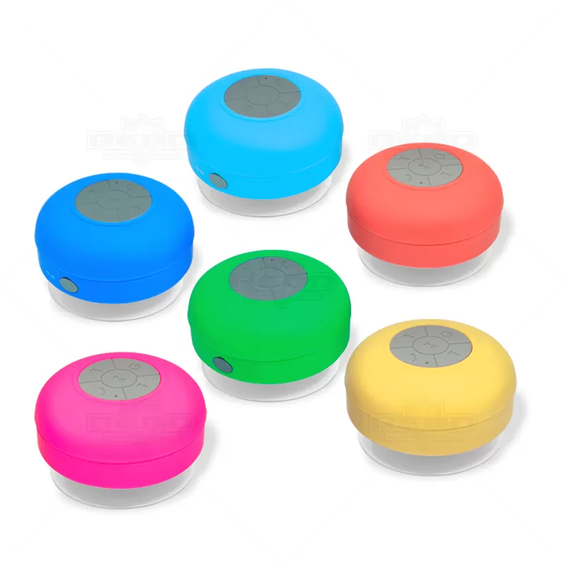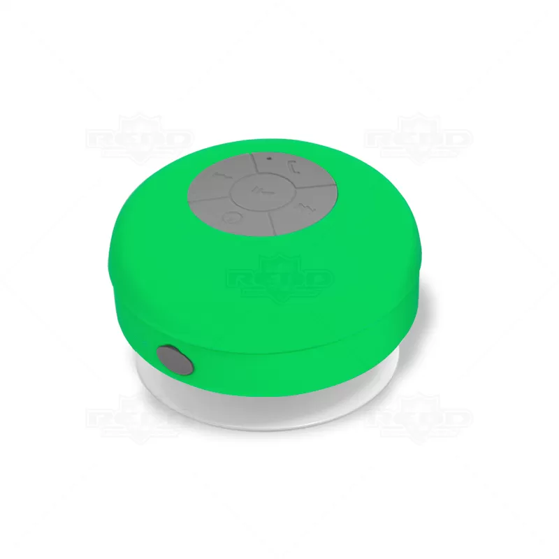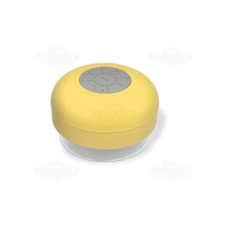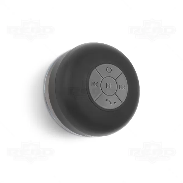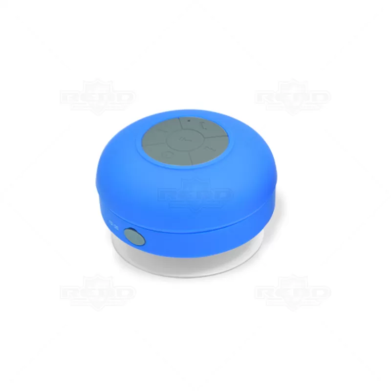 Caixa de som personalizada, produzida em plástico e camada emborrachada, resistente à água. Conta com ventosa podendo ser fixada no box ou parede do banheiro, potência de 4W, Bluetooth, microfone embutido para responder suas chamadas telefônicas e bateria recarregável. É recomendável carregar por 4 horas antes da primeira utilização. Ideal para brindes personalizados e eventos corporativos.