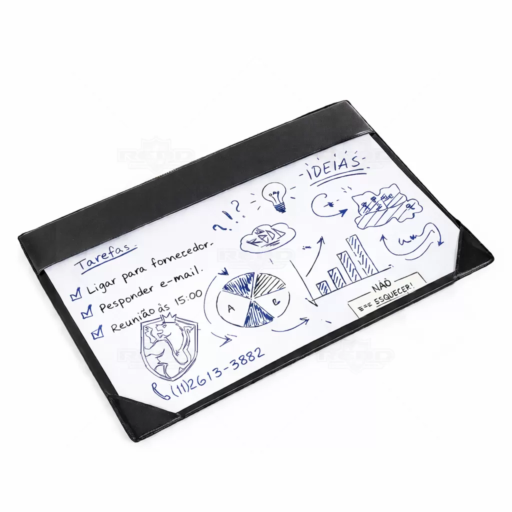 Risque rabisque com base em papelão resistente. Formato A4. Base rígida revestida em PVC de alta qualidade, proporcionando maior durabilidade e acabamento uniforme. Possui cantoneiras reforçadas para fixação das folhas, facilitando a reposição. Acompanha 2 folhas brancas A4, indicadas para rascunho, anotações rápidas e uso contínuo em mesa. Produto compacto, estável e de fácil manuseio. Indicado para mesas de trabalho, recepções e home office, permite organização prática de anotações, lembretes e planejamentos diários, mantendo as informações sempre visíveis e acessíveis. Uma solução funcional e discreta para ambientes corporativos ou uso pessoal, contribuindo para uma rotina mais organizada, produtiva e visualmente alinhada ao espaço de trabalho.