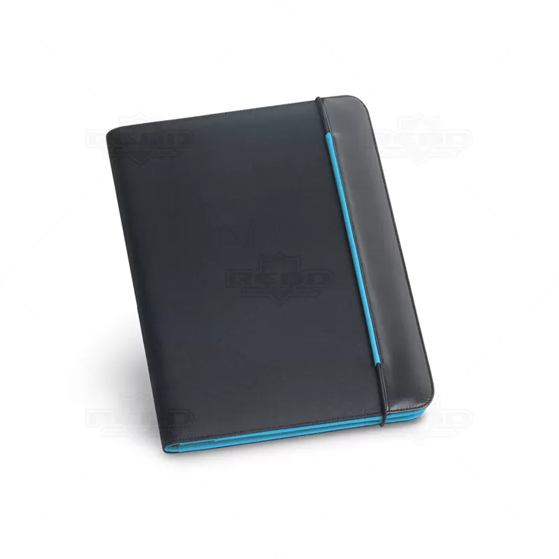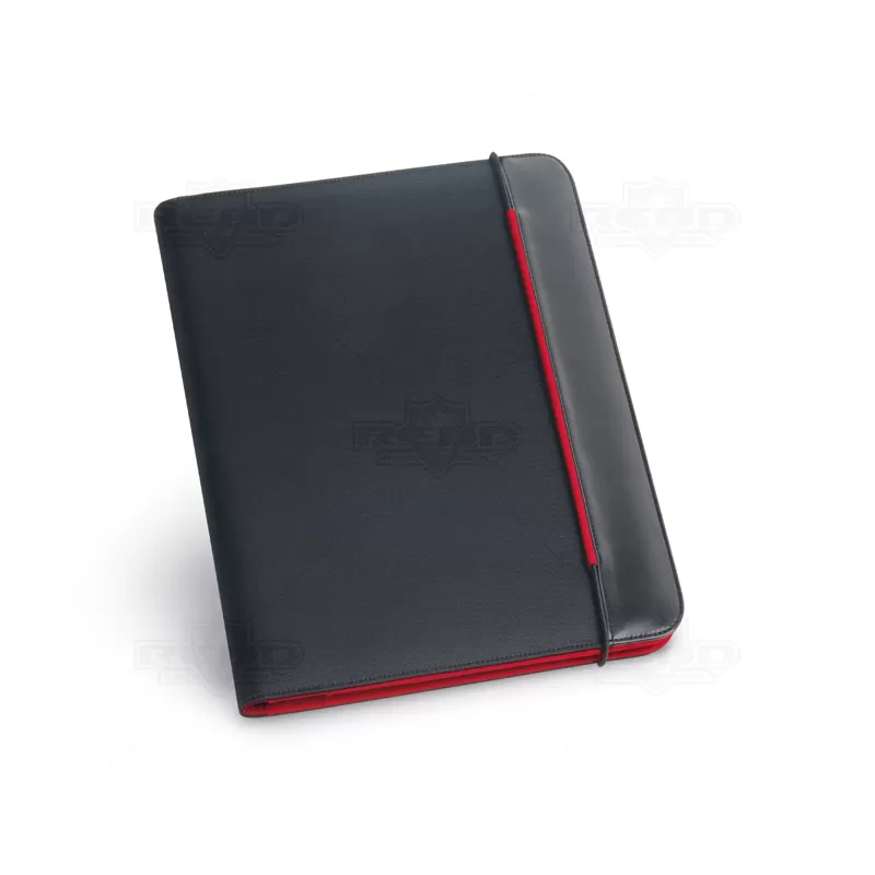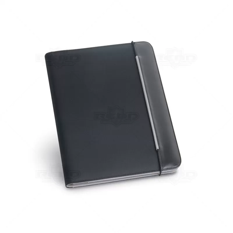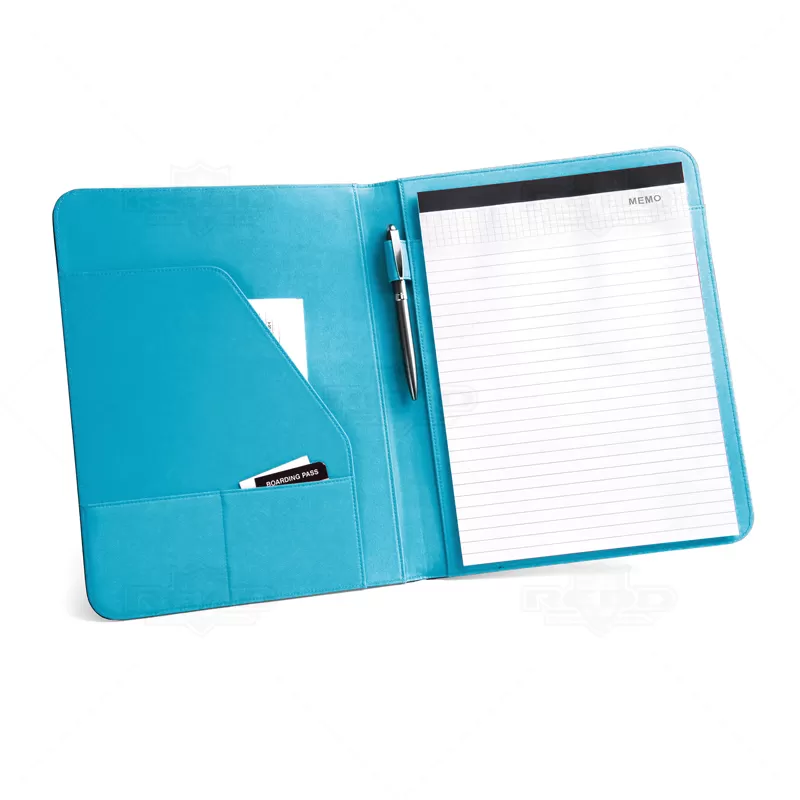 Pasta executiva personalizada, produzida em couro sintético e 800D poliéster, possui Interior em microfibra, porta caneta, porta documentos e bloco com 20 folhas pautadas. Ideal para brindes personalizados e eventos corporativos. Objetos decorativos não acompanham o produto.