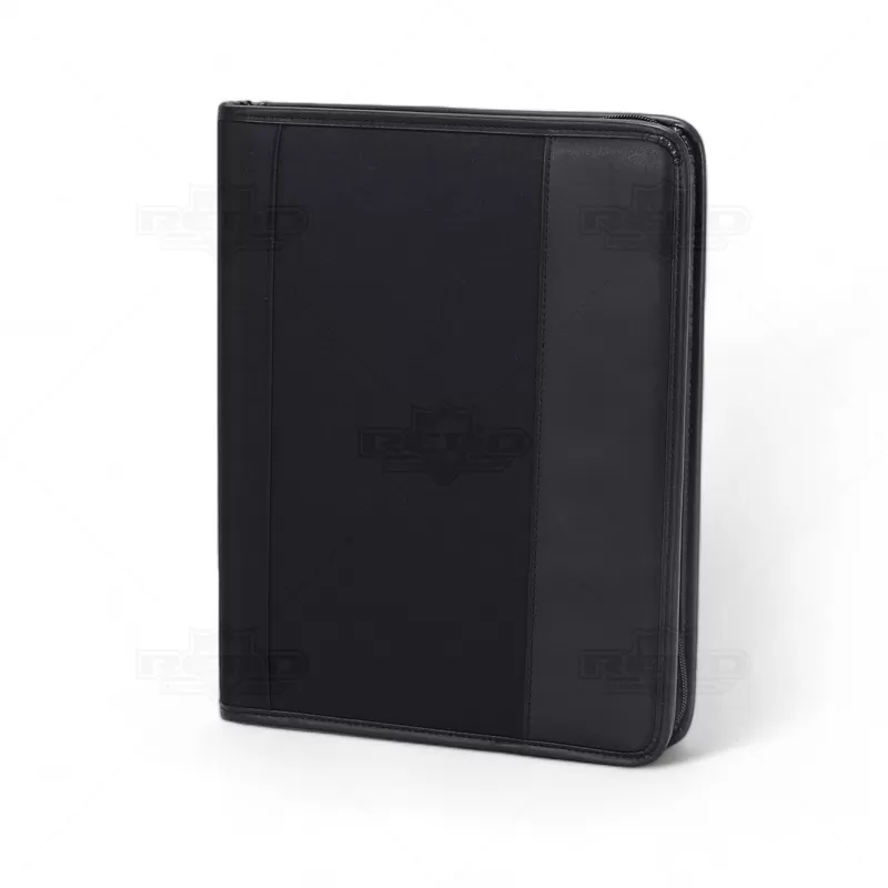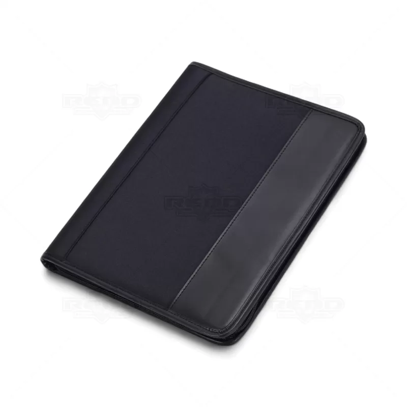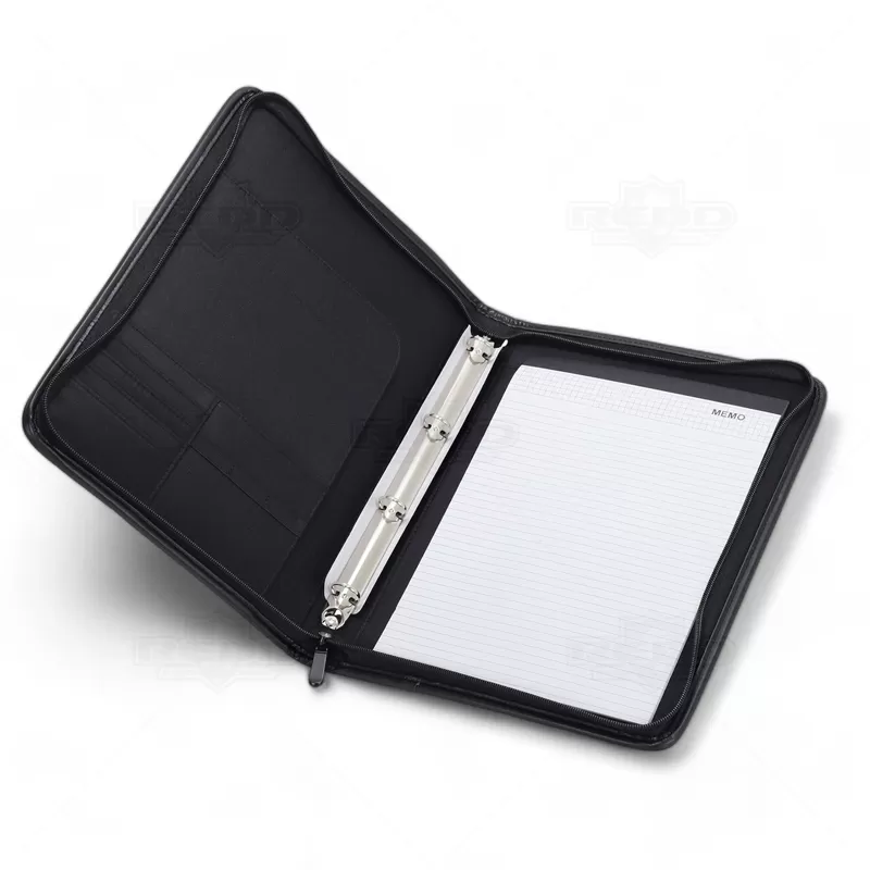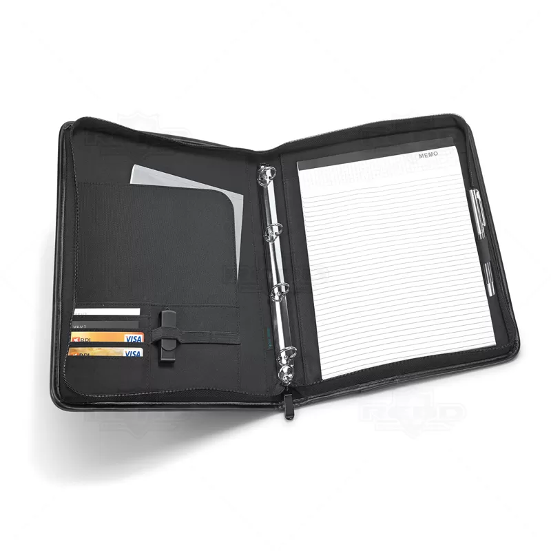 Pasta executiva personalizada, produzida em couro sintético e microfibra, possui 4 argolas de 20 mm para folhas A4 estilo fichário, bloco com 20 folhas pautadas, porta documentos, porta catões, porta caneta e porta pen drive. Objetos decorativos não acompanham o produto. Ideal para brindes personalizados, eventos promocionais e corporativos.