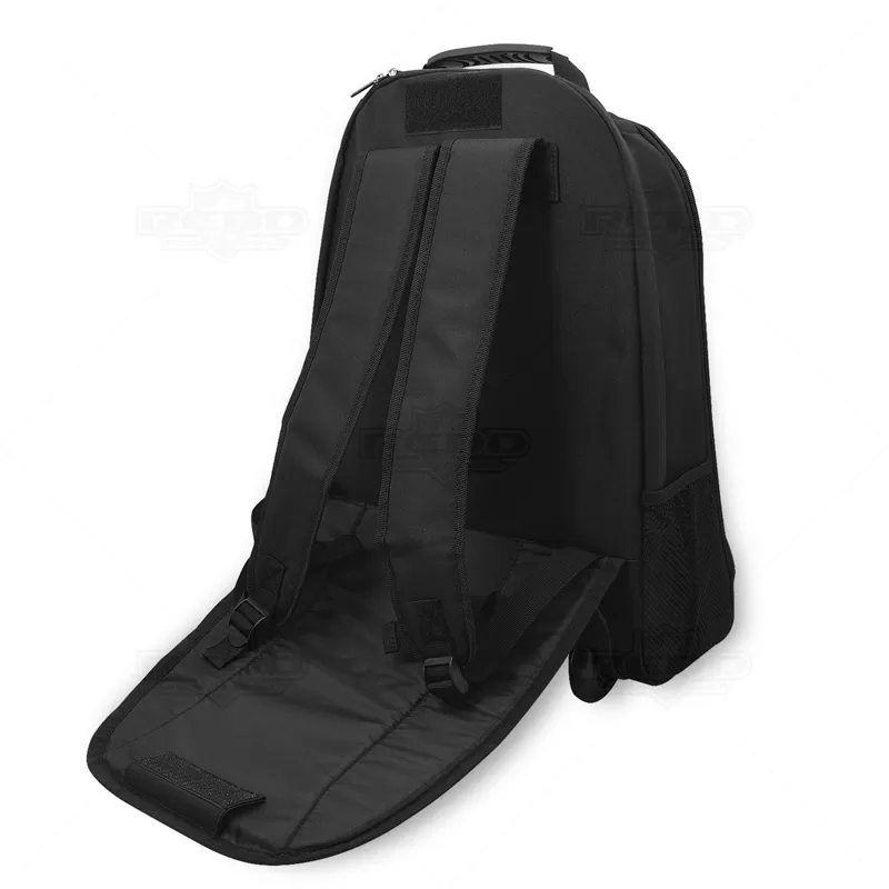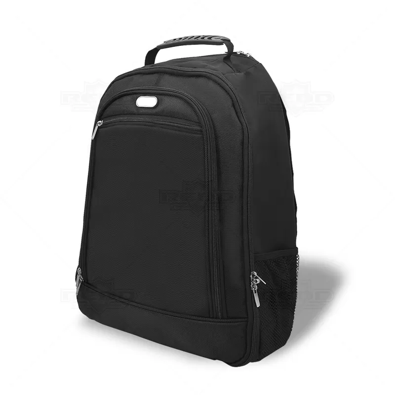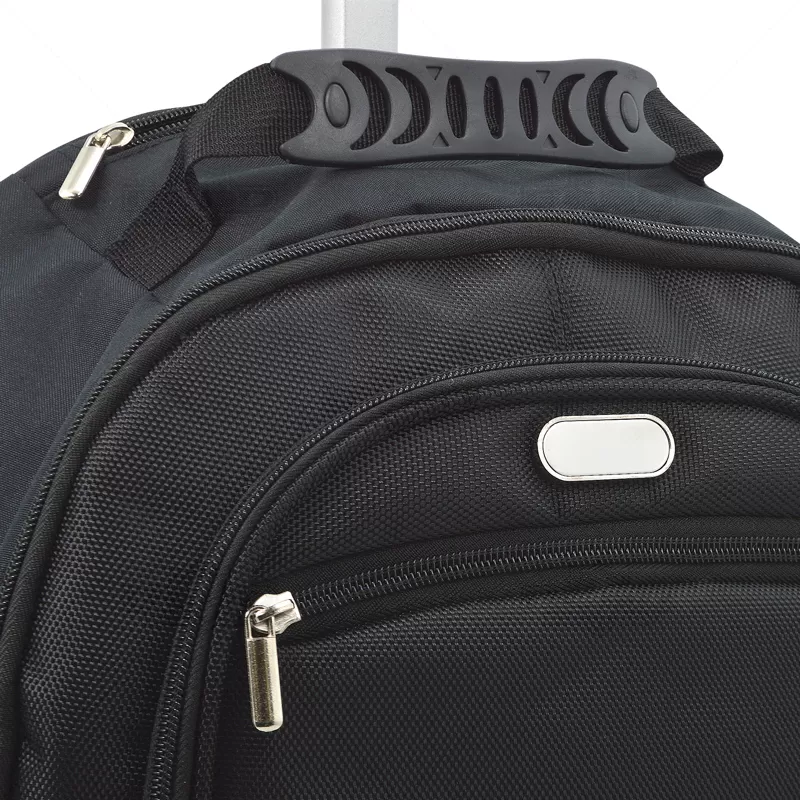 Mochila trolley para notebook. 1680D e 600D. Com 2 rodas. Compartimento principal para notebook 15"Pol, com acabamento almofadado. Segundo compartimento forrado e com diversos bolsos. Bolso frontal com zipper e bolsos laterais com tela. Com protetor de rodas em poliéster.