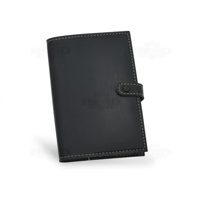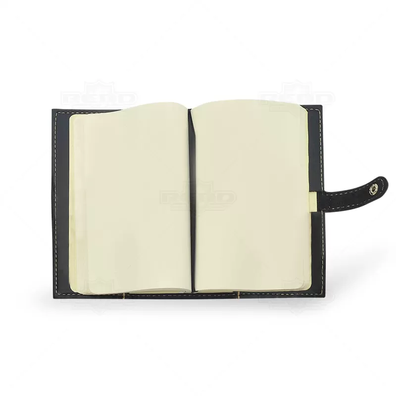 Bloco de Anotações em material sintético personalizado, possui aproximadamente 80 folhas lisas sem pautas e lingueta para maior segurança ao transportá-lo. Ideal para brindes promocionais e eventos corporativos.