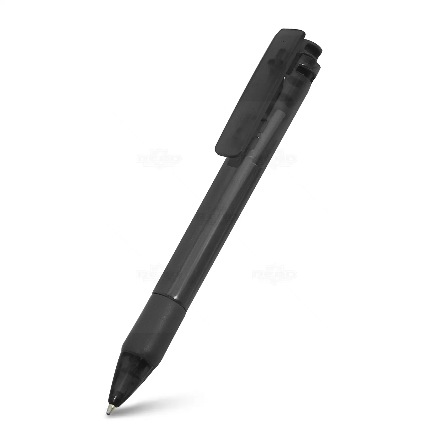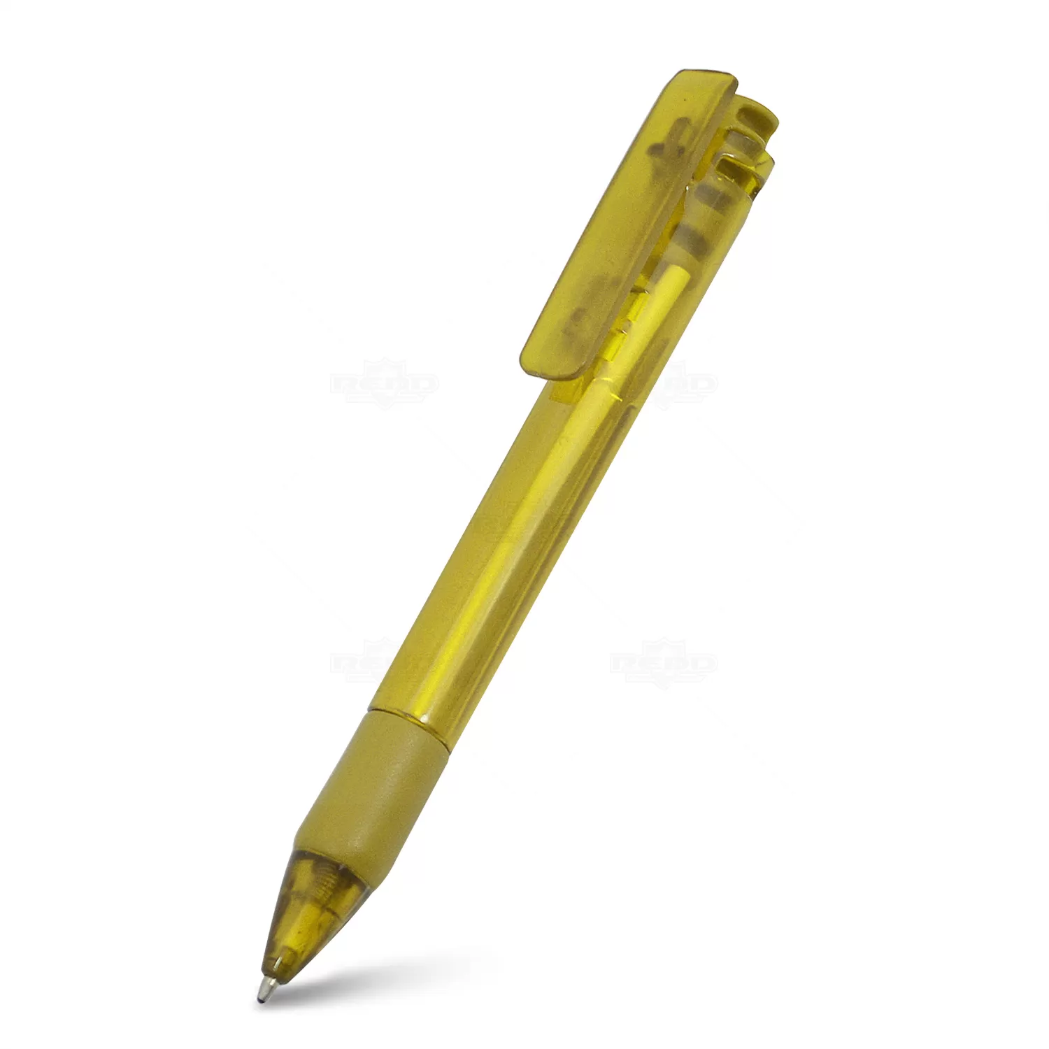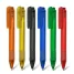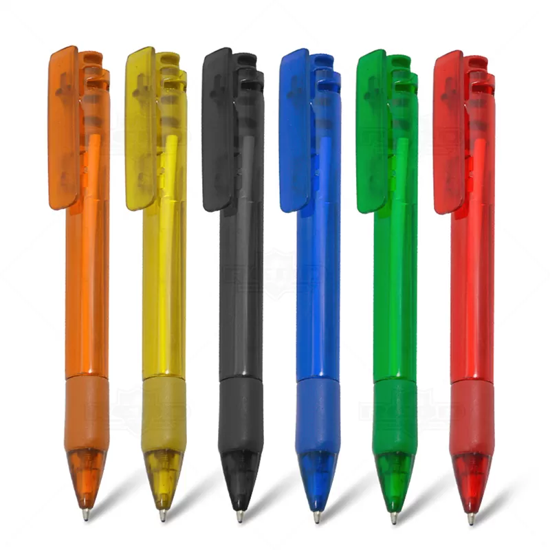 Caneta plástica personalizada com clip injetado, click e clip acompanhando a cor da caneta, acionamento da ponteira por click e escrita na cor azul. Ideal para brindes promocionais e eventos corporativos.