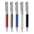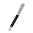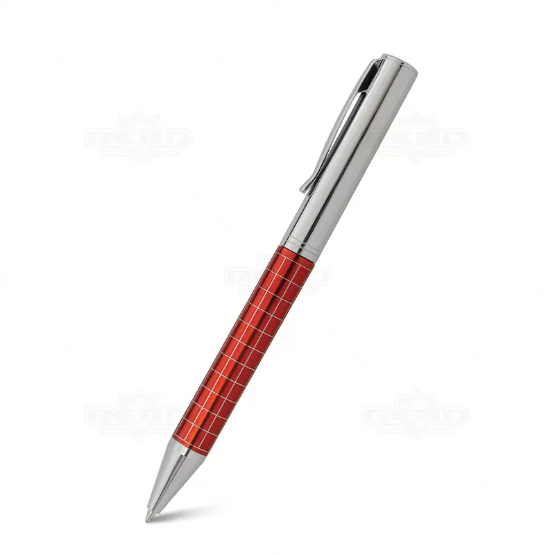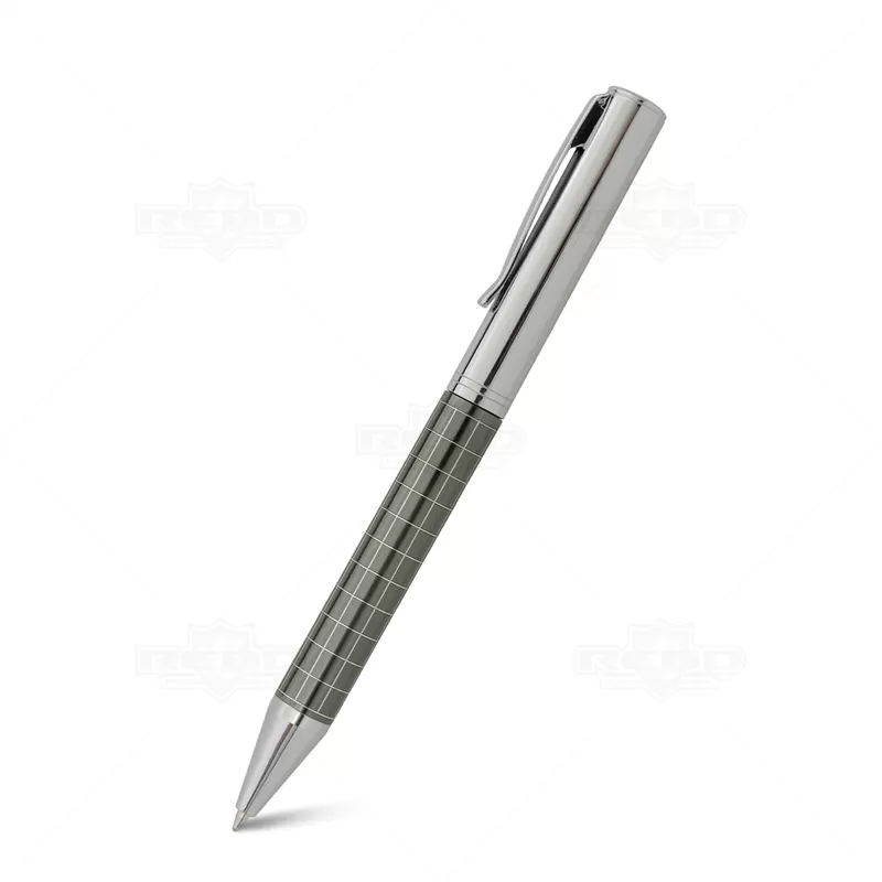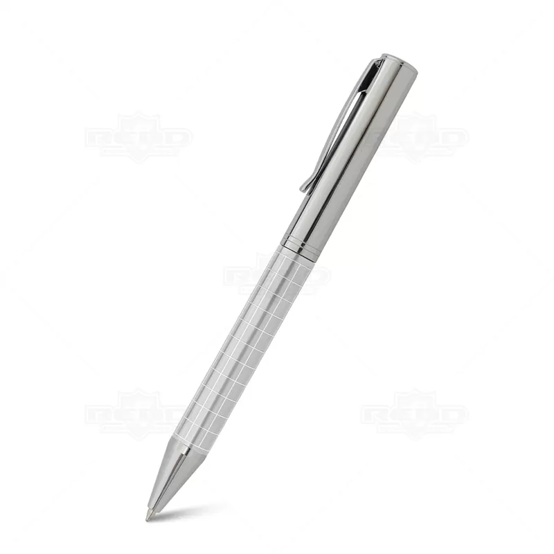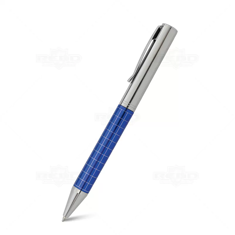 Caneta de metal personalizada com detalhes quadriculados e cromados no corpo. Possui escrita azul com acionamento giratório e clip de metal. Ideal para eventos corporativos e brindes promocionais personalizados.