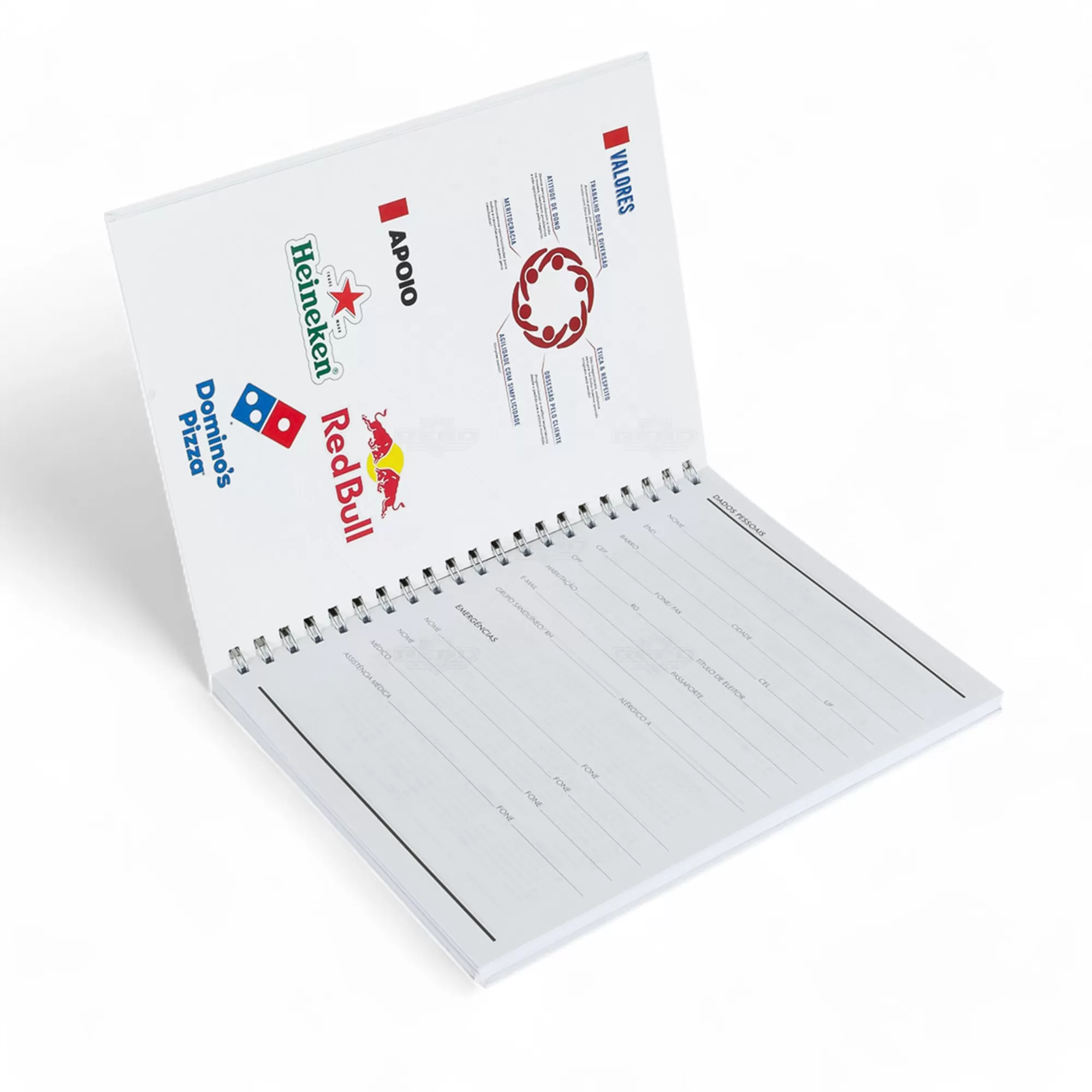 Caderno Laminado Fosca Personalizado, com 192 páginas, acabamento em wire-o prata e 8 páginas iniciais sendo: Dados Pessoais, Calendários, Planejamento Anual e Trimestral. Todas as suas anotações e exercícios estarão muito bem dispostos e organizados. A gravação em marca d'água consta em todas as páginas internas. Ideal para brindes promocionais e eventos corporativos.