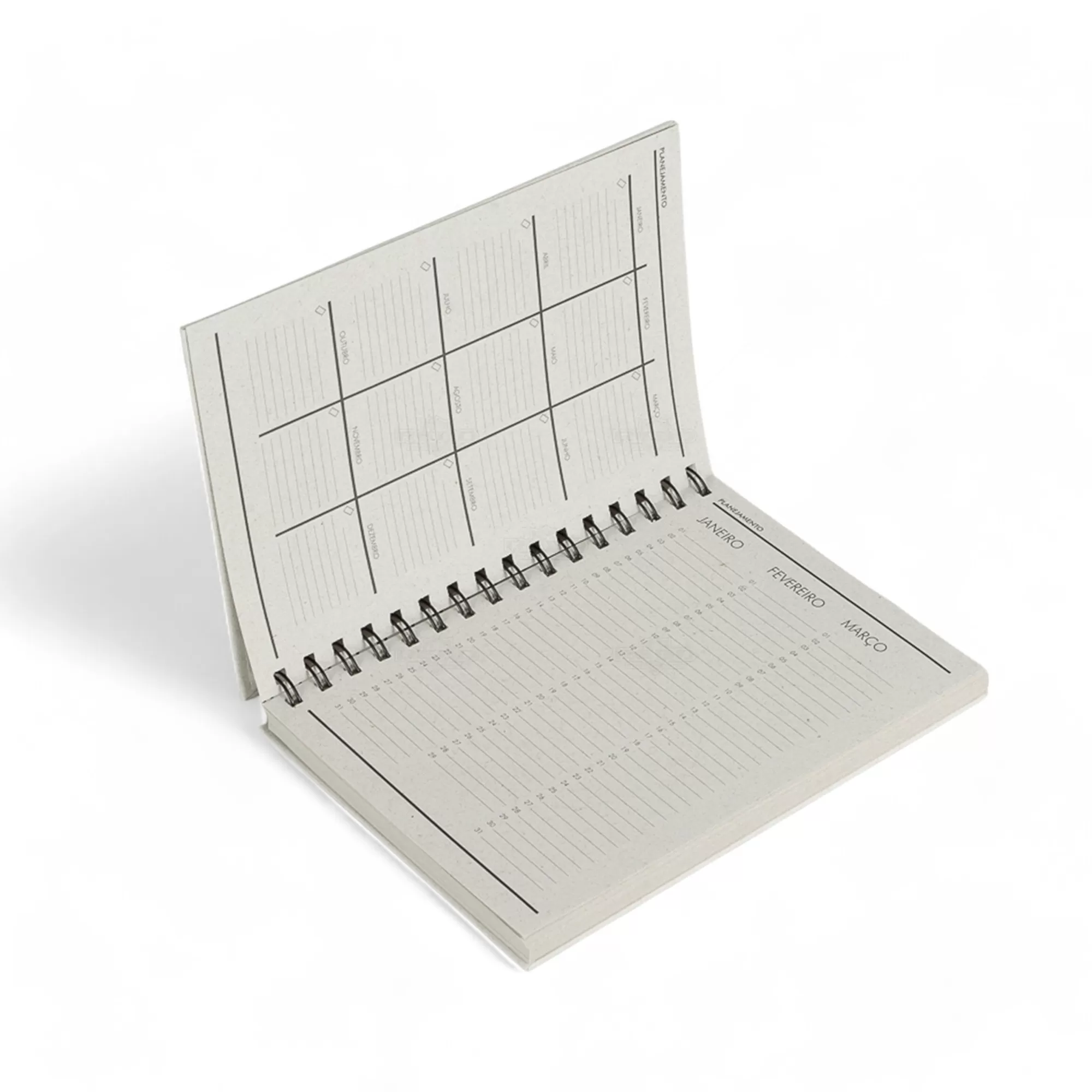 Caderno Reciclado Personalizado, com 192 páginas, acabamento em wire-o prata e 8 páginas iniciais sendo: Dados Pessoais, Calendários, Planejamento Anual e Trimestral. Todas as suas anotações e exercícios estarão muito bem dispostos e organizados. A gravação em marca d'água consta em todas as páginas internas. Ideal para brindes promocionais e eventos corporativos.