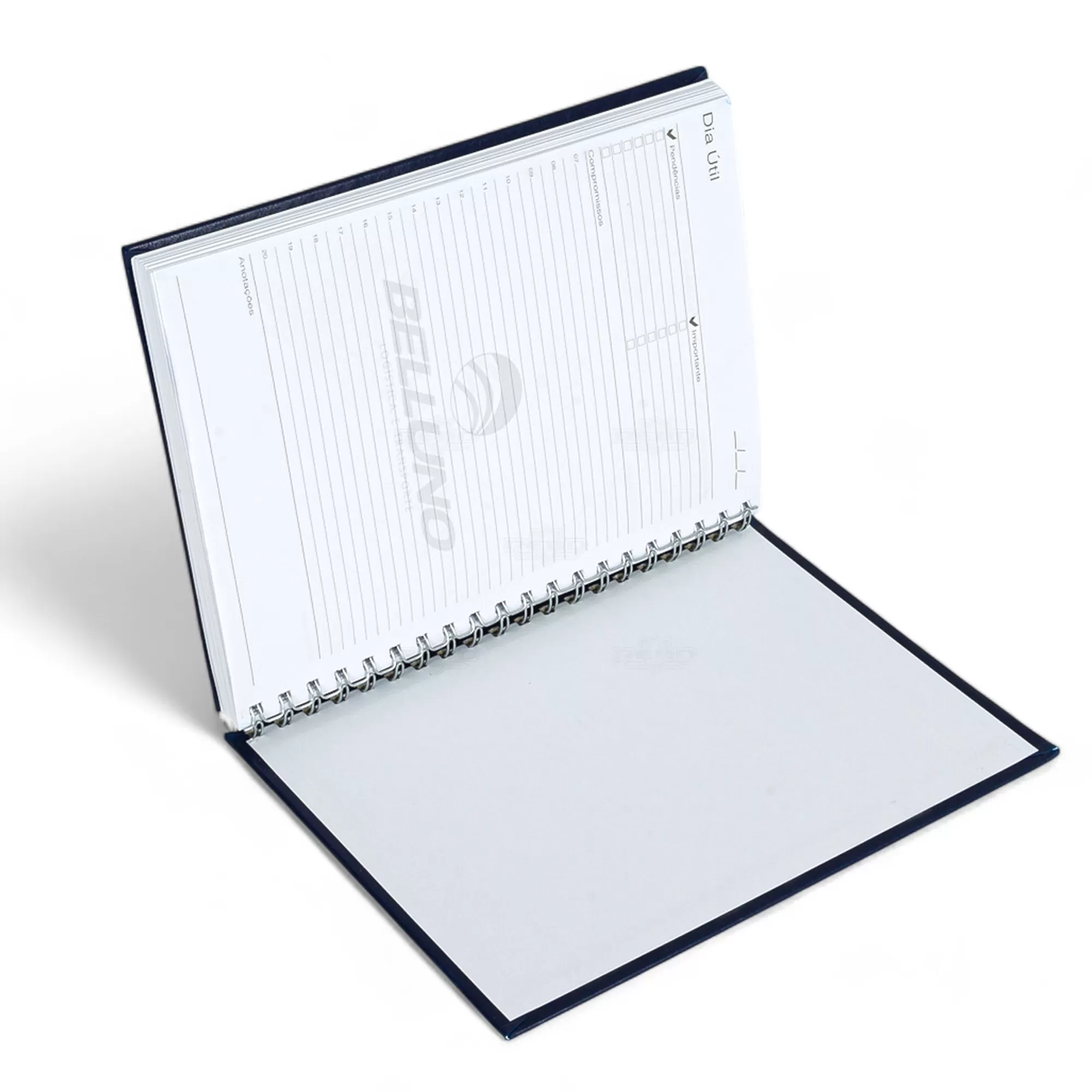 Caderno Personalizado, com 192 páginas, acabamento em wire-o prata e 8 páginas iniciais sendo: Dados Pessoais, Calendários, Planejamento Anual e Trimestral. Todas as suas anotações e exercícios estarão muito bem dispostos e organizados. A gravação em marca d'água consta em todas as páginas internas. Ideal para brindes promocionais e eventos corporativos.