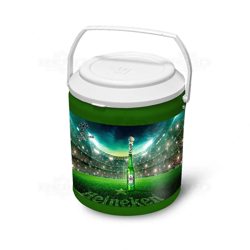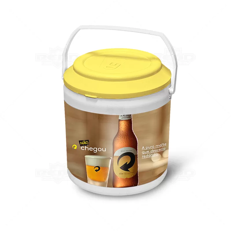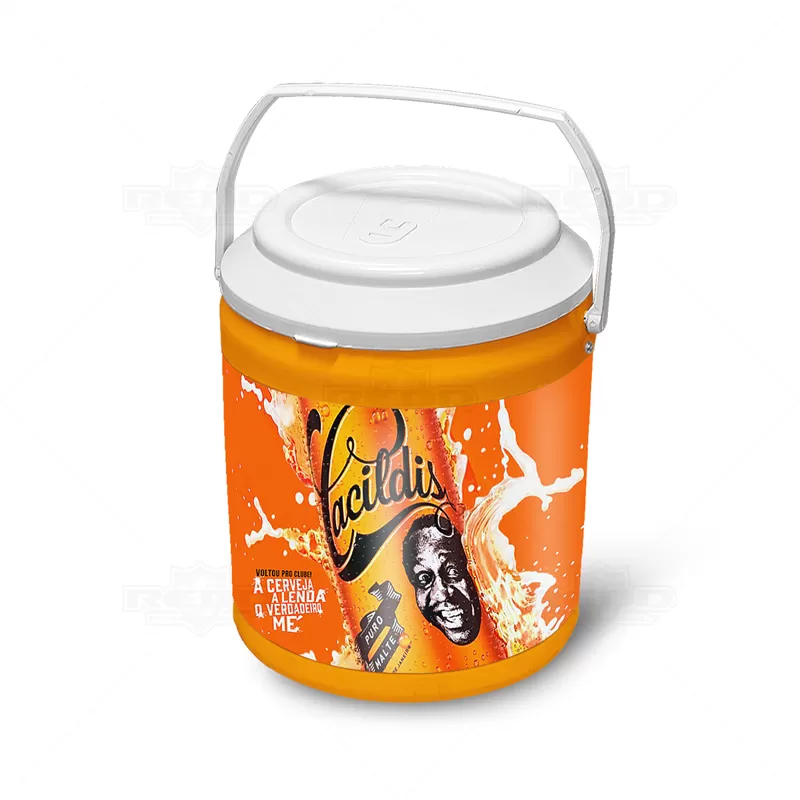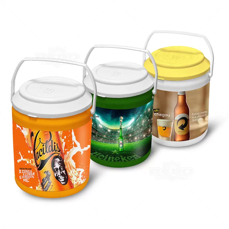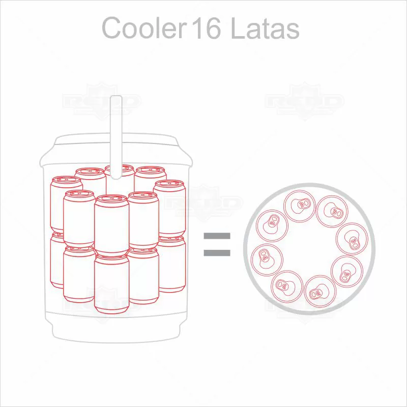 Cooler térmico personalizado em formato lata de cerveja com capacidade para 16 latas. Possui alças para transporte e tampa que mantém sua bebida gelada por mais tempo.Obs: A disposição das latas deverá ser distribuídas em 2 fileiras de 8 latas empilhadas verticalmente para depois ser completado com gelo. A partir de 100 pçs é possível produzir o cooler com cores de tampa e corpo colorido, para quantidades inferiores os produtos deverão se limitar as cores branco, preto ou cinza. Objetos decorativos não acompanham o produto. Ideal para brindes personalizados e eventos corporativos.