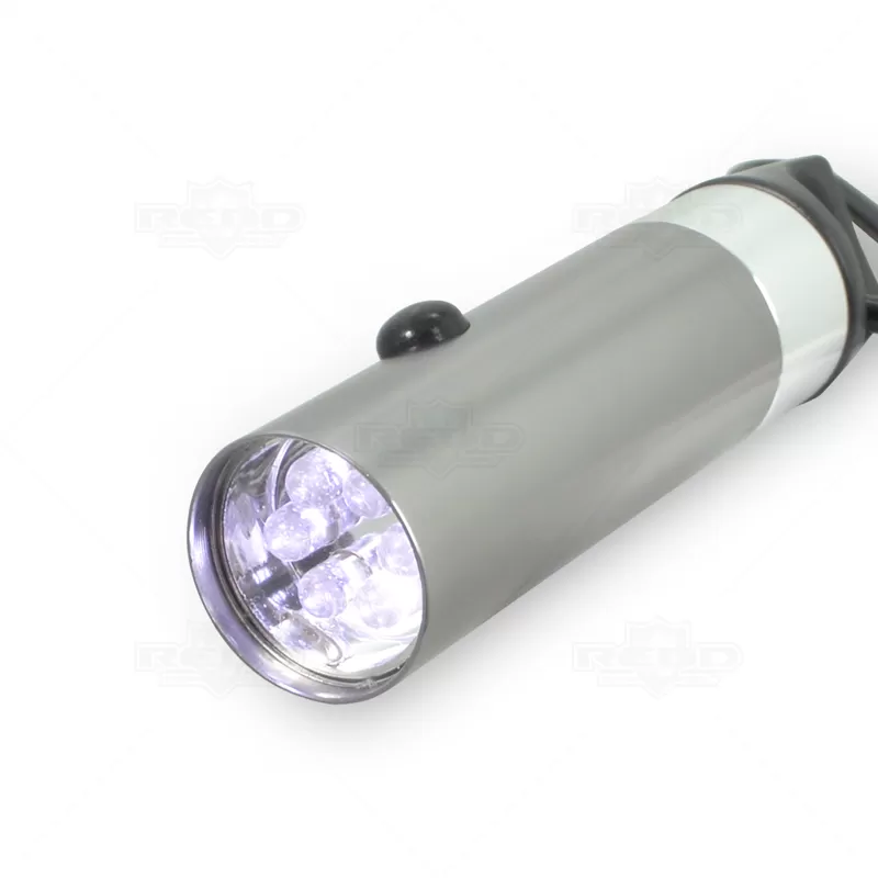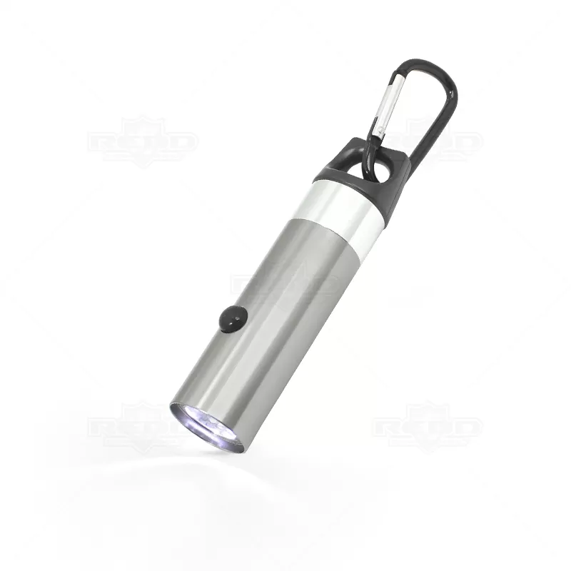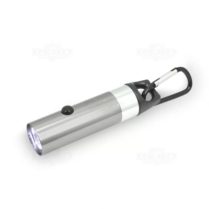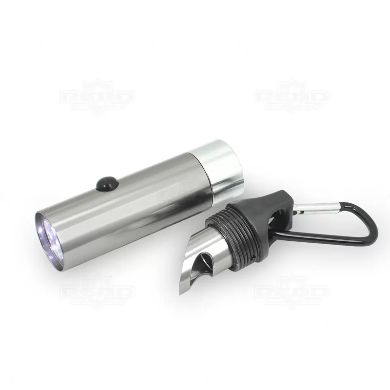 Lanterna de alumínio personalizada, com 6 LEDs que funcionam com 2 pilhas CR2032 (inclusas), abridor de garrafas na tampa quando desrosqueada e mosquetão na parte superior. Ideal para divulgar sua empresa em eventos corporativos, brindes personalizados e campanhas promocionais.