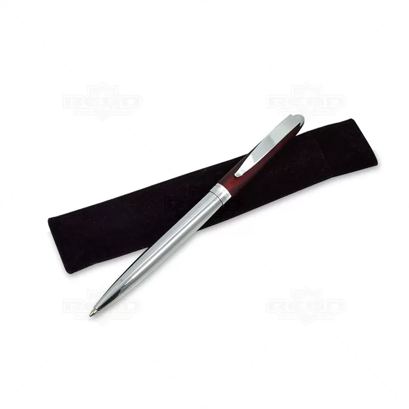 Caneta de metal personalizada com detalhe colorido, possui clip de metal, esferográfica na cor azul, estojo de veludo e acionamento da escrita através do sistema giratório. Ideal para divulgar sua empresa em eventos corporativos, brindes personalizados e campanhas promocionais.