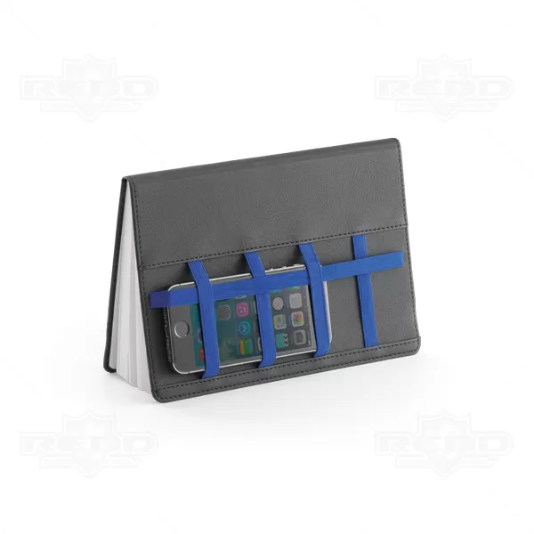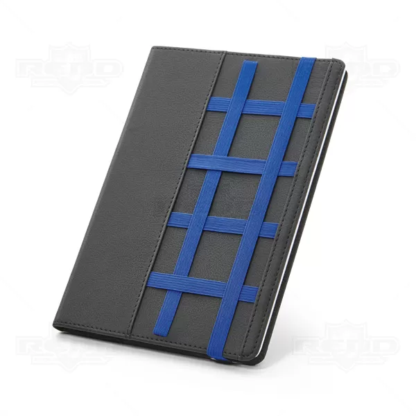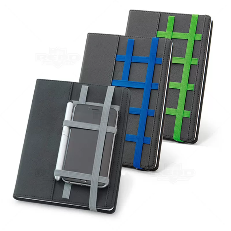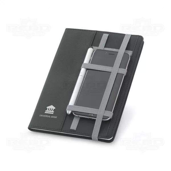 Bloco de anotações personalizado com 80 folhas não pautadas. Possui elástico para acomodar canetas, lapiseiras, cartões e seus objetos pessoais do dia dia. Acompanha embalagem de non-woven. Caneta esferográfica e smartphone não inclusa.