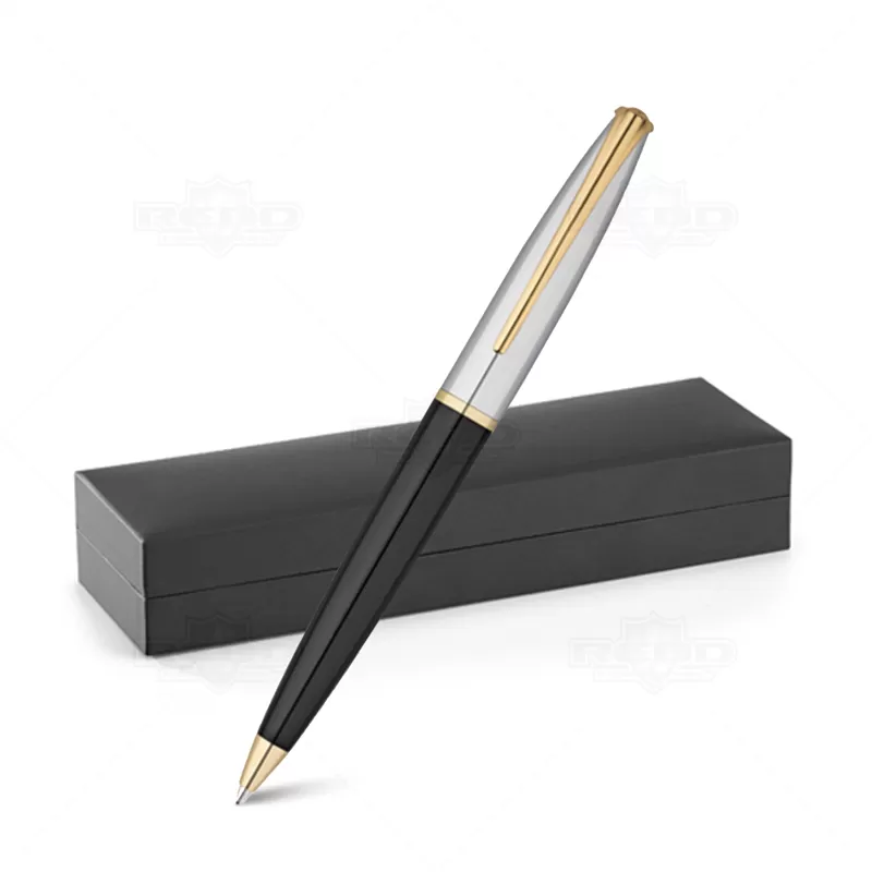 Caneta esferográfica com detalhes dourado no clip e na ponteira, possui acionamento da escrita por giro e estojo elegante com um toque luxuoso. Ideal para divulgar sua empresa em eventos corporativos, brindes personalizados e campanhas promocionais.