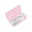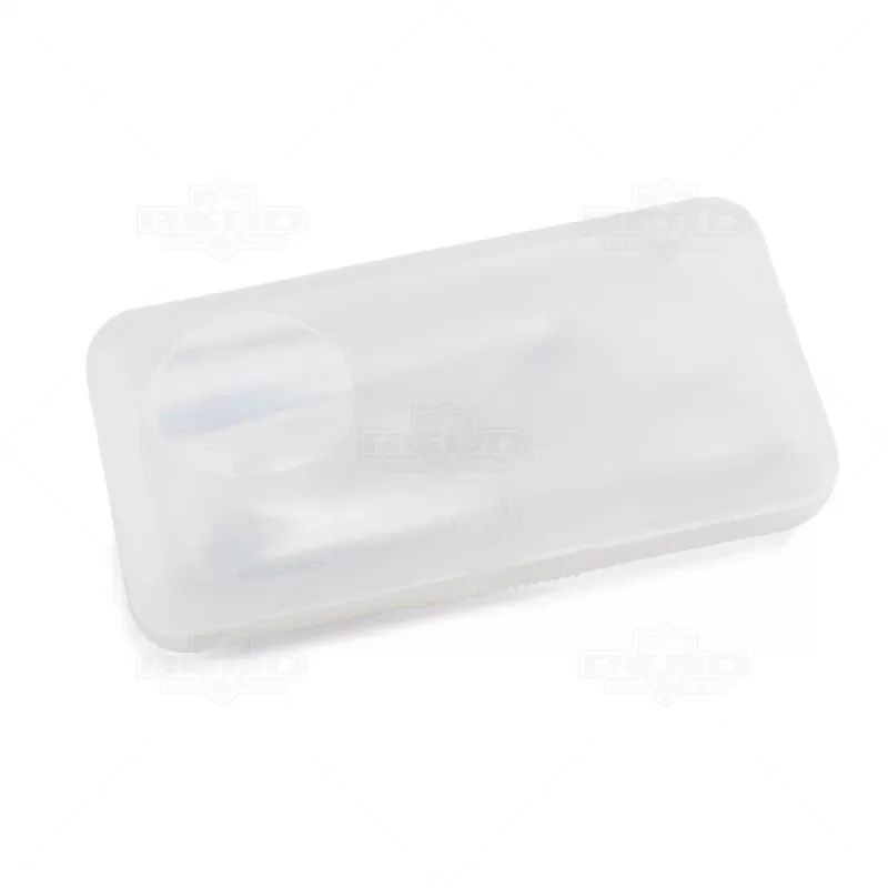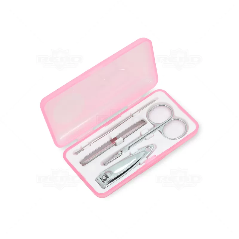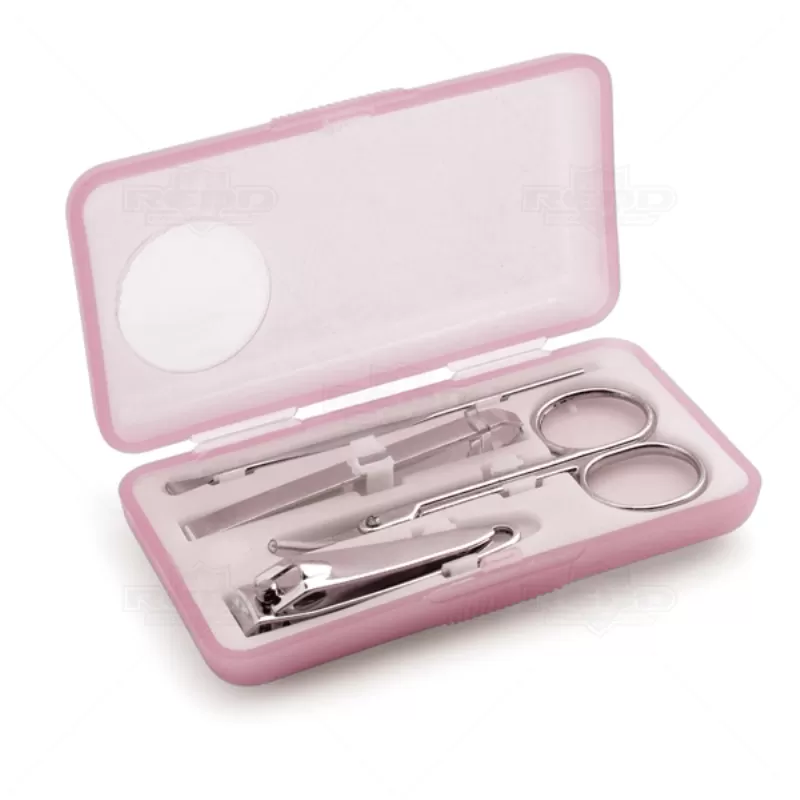 Kit manicure personalizado com 4 peças. Possui estojo personalizado em ABS translúcido, 1 cortador de unha, 1 pinça, 1 tesoura e 1 empurrador de cutículas. Ideal para brindes promocionais e eventos corporativos.