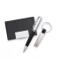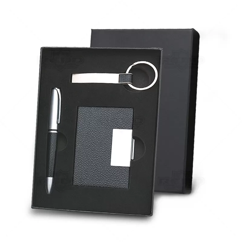 Conjunto executivo com 3 peças, Possui embalagem em estojo de papelão com tampa e parte interna revestida de espuma. Contém: 1 chaveiro metal fosco com detalhe emborrachado preto, 1 porta cartão de couro sintético(verso metálico liso) com placa de metal e 1 caneta de metal fosca com esferográfica na cor azul. Ideal para brindes personalizados e eventos corporativos.