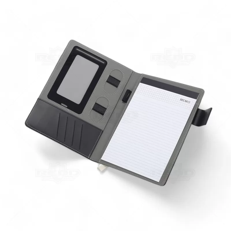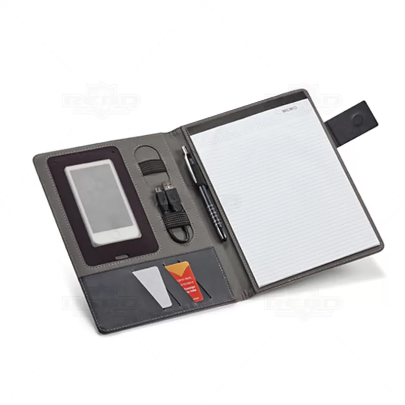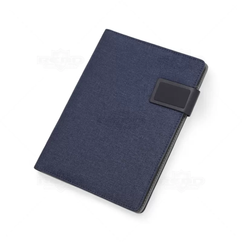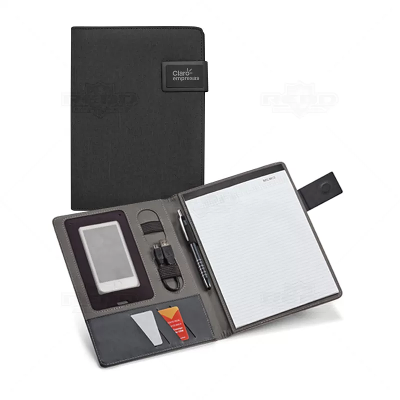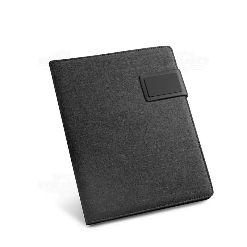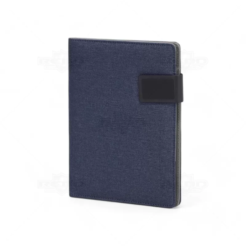 Pasta executiva personalizada, com acabamento diferenciado em tecido mescla, possui 20 folhas pautadas, porta smartphone, porta canetas, porta borracha e porta cartões de visita. Conta com fecho imantado e placa metálica própria para personalização. Ideal para eventos corporativos e brindes promocionais. Objetos e acessórios não inclusos ao produto.