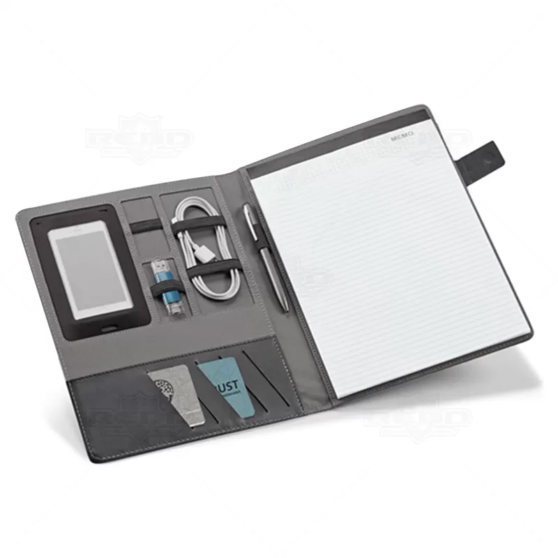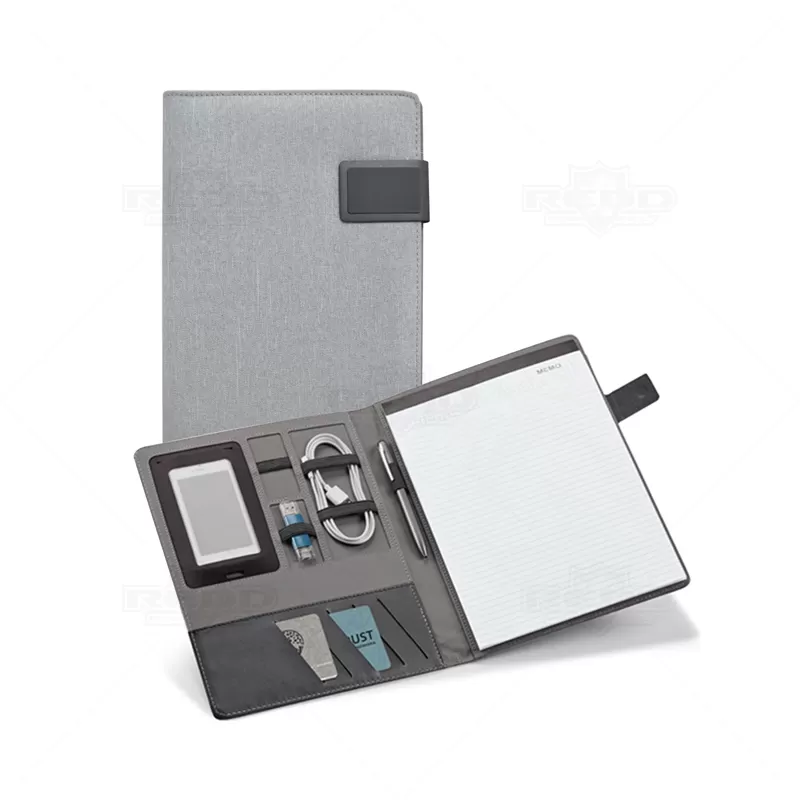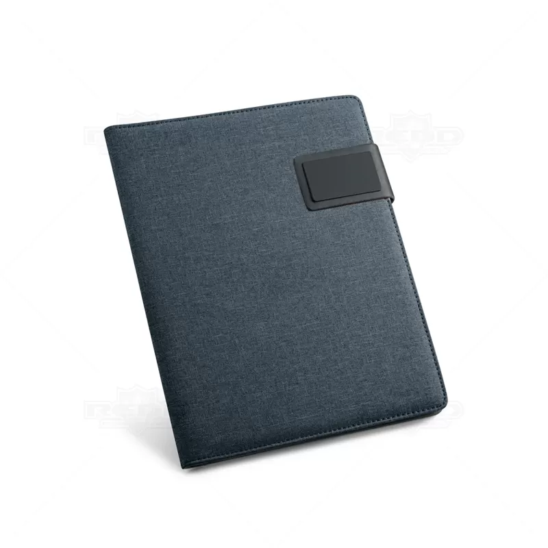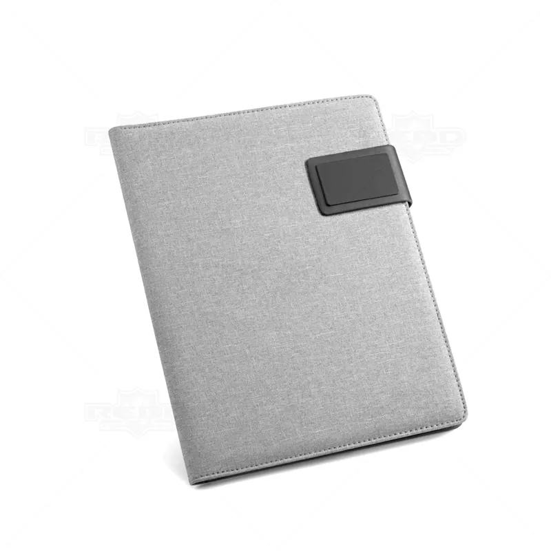 Pasta executiva personalizada, com acabamento diferenciado em tecido mescla, possui 20 folhas pautadas, porta smartphone, porta canetas, porta borracha e porta cartões de visita. Conta com fecho imantado e placa metálica própria para personalização. Ideal para eventos corporativos e brindes promocionais. Objetos e acessórios não inclusos ao produto.