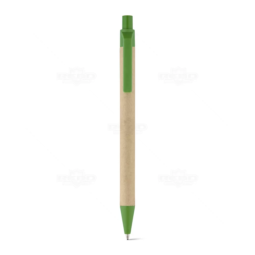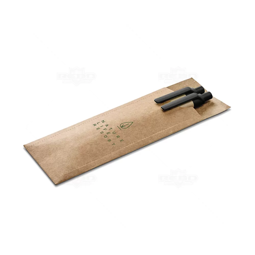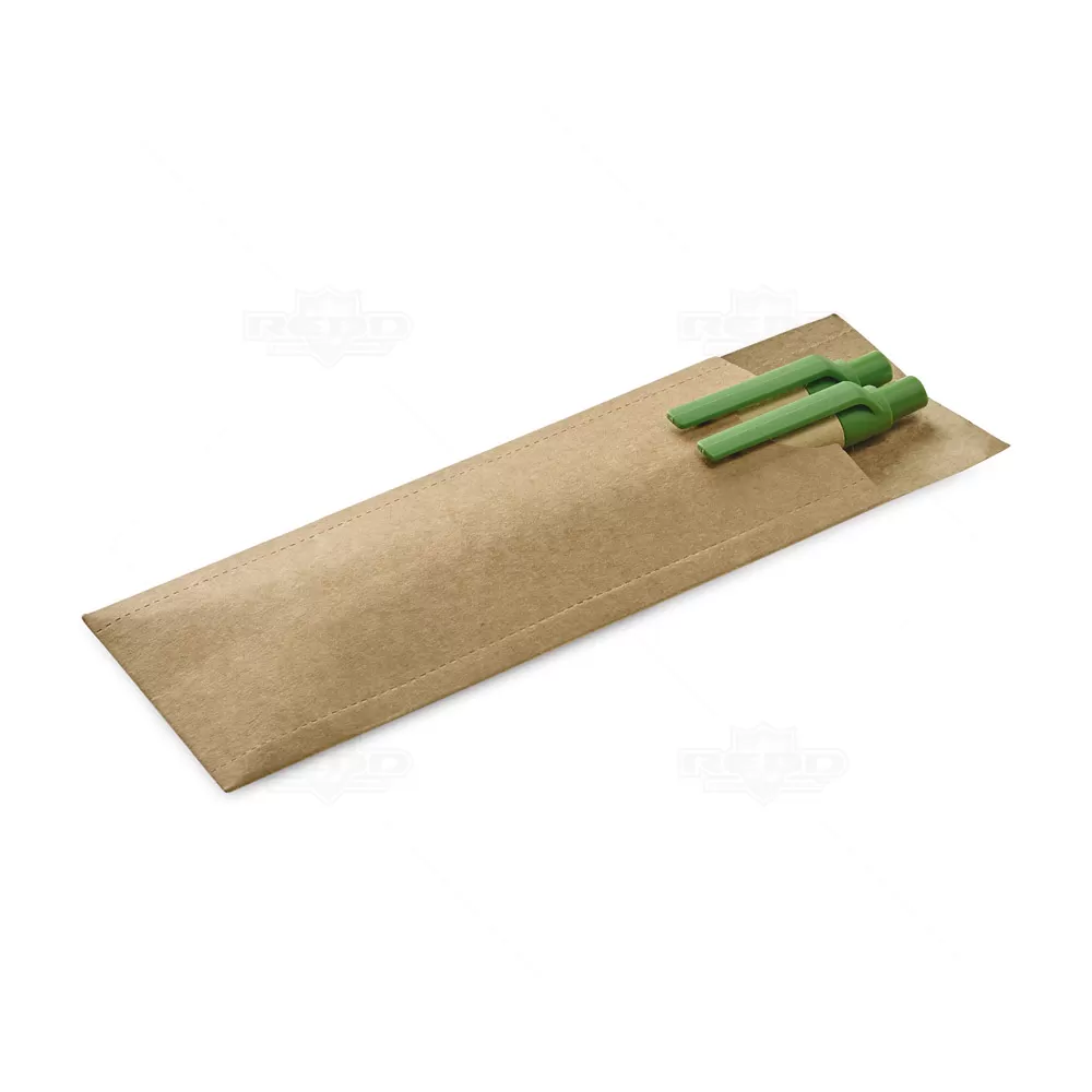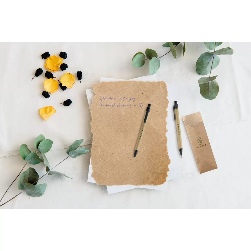Caneta e lapiseira em Papel kraft reciclável com escrita macia, ponteira e clip de plástico. Acompanha embalagem personalizada. Ideal para eventos corporativos e brindes promocionais. Imagem ilustrativa.
