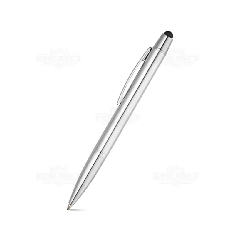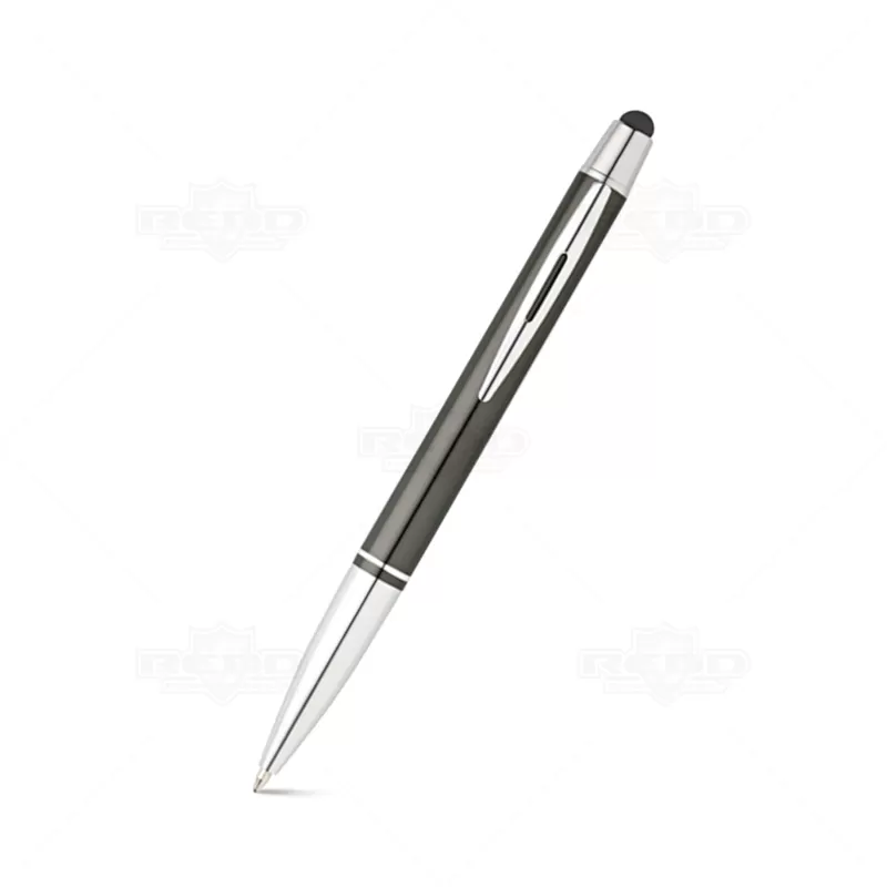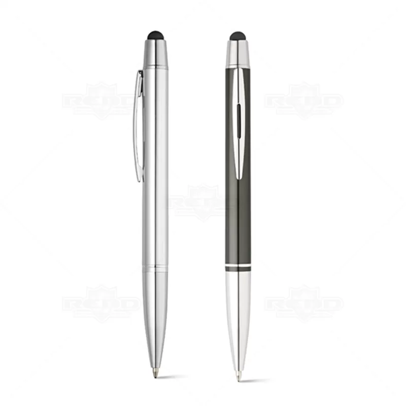 Caneta de metal, produzida em alumínio, esferográfica com escrita azul e acionamento através do mecanismo de giro (twist); e ponteira touch que proporciona o uso em seu tablet e smartphone. Possui acabamento brilhoso elegante. Ideal para eventos corporativos e brindes promocionais.