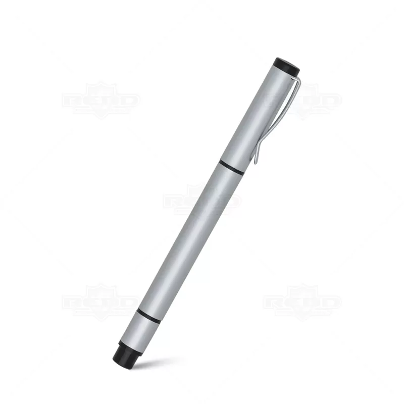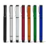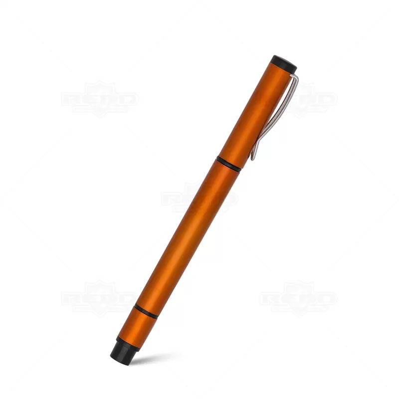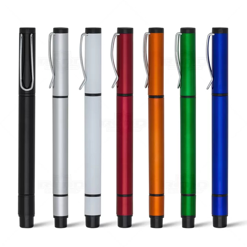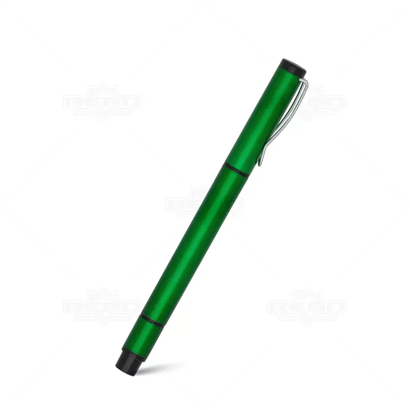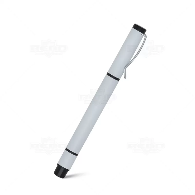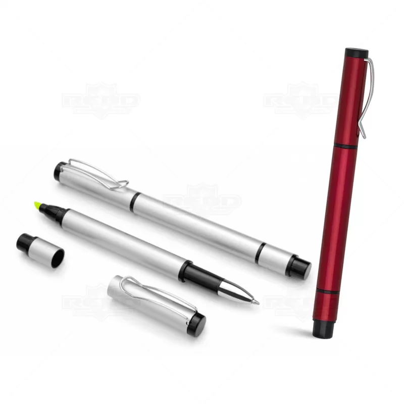 Caneta plástica personalizada com corpo e tampa plástica, possui clip de metal, marca texto na cor amarelo e escrita na cor azul. Ideal para eventos corporativos e brindes promocionais.