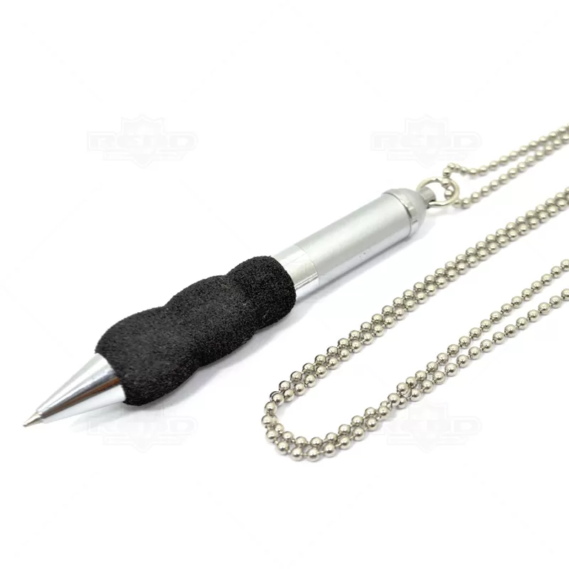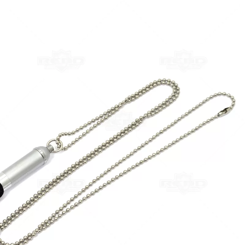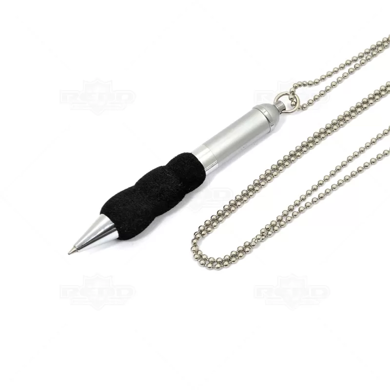 Caneta de metal esferográfica personalizada, com detalhe em E.V.A. macio que assegura uma escrita confortável. Produzida em metal, possui corrente de 2,5mm para que possa usar pendurada no pescoço, fixada a uma prancheta ou como melhor lhe convier. Ideal para eventos corporativos e brindes promocionais. Tamanho da corrente: 45,0 x 0,25 cm.