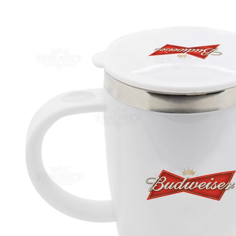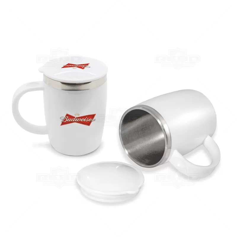 Caneca plástica personalizada, produzida em inox e revestida em plástico ABS. Possui alça resistente e anatômica, acabamento nas bordas em inox e ainda tampa protetora com anel de vedação em silicone, com capacidade para até 450ml. Perfeita para deixar aquele café quentinho em sua mesa de estudo ou local de trabalho. Ideal para brindes promocionais e eventos corporativos.