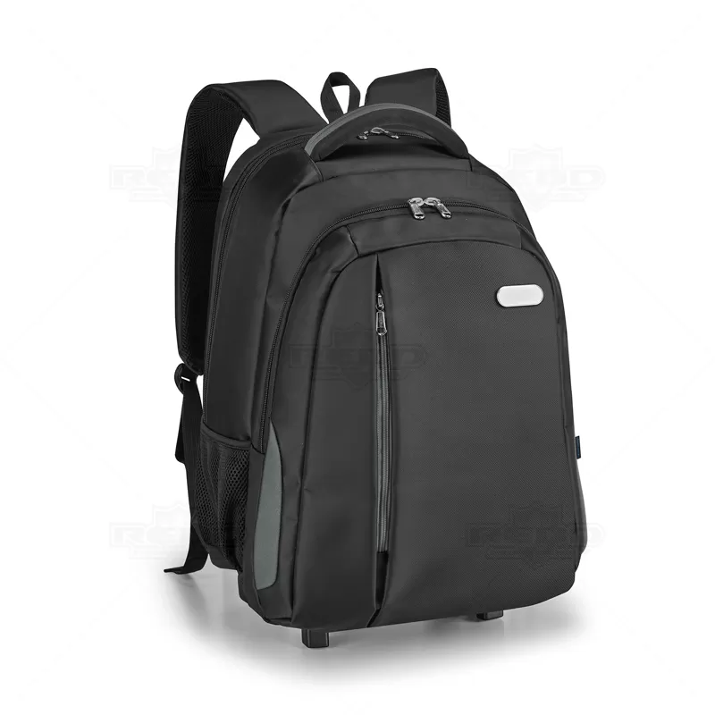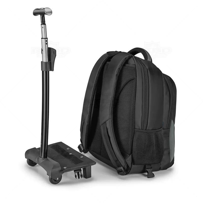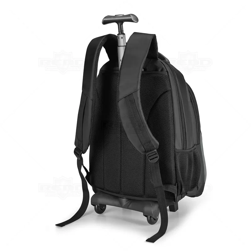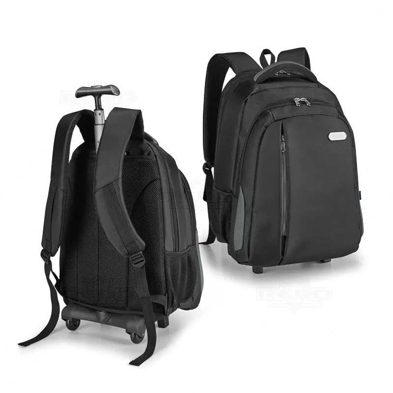 Produzida em Nylon 999, material à prova de água, possui compartimento principal almofadado para notebook de até 17''. Segundo compartimento forrado e com diversos bolsos. Bolso frontal com zíper e bolsos laterais com tela. Com estrutura removível e 2 rodas. Puxador extensível em alumínio, com mola (altura o puxador: 550 mm). Chapa metálica removível com ímã para fácil gravação.
