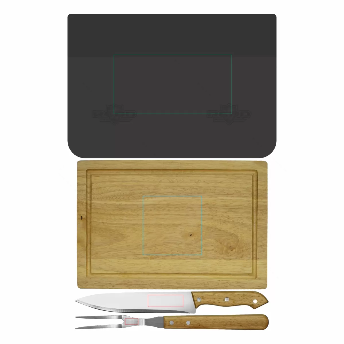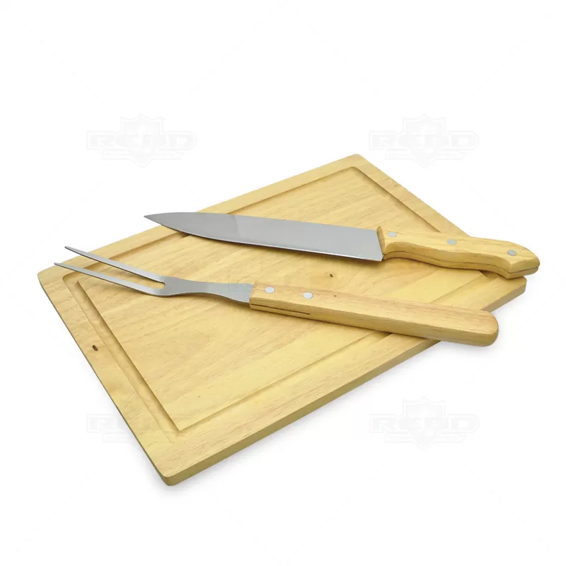 Kit churrasco personalizado com 1 Faca, 1 Garfo e 1 tábua de madeira personalizada para cortes de carne e estojo personalizado com alça em nylon. Ótima opção para eventos promocionais e brindes corporativos.