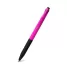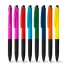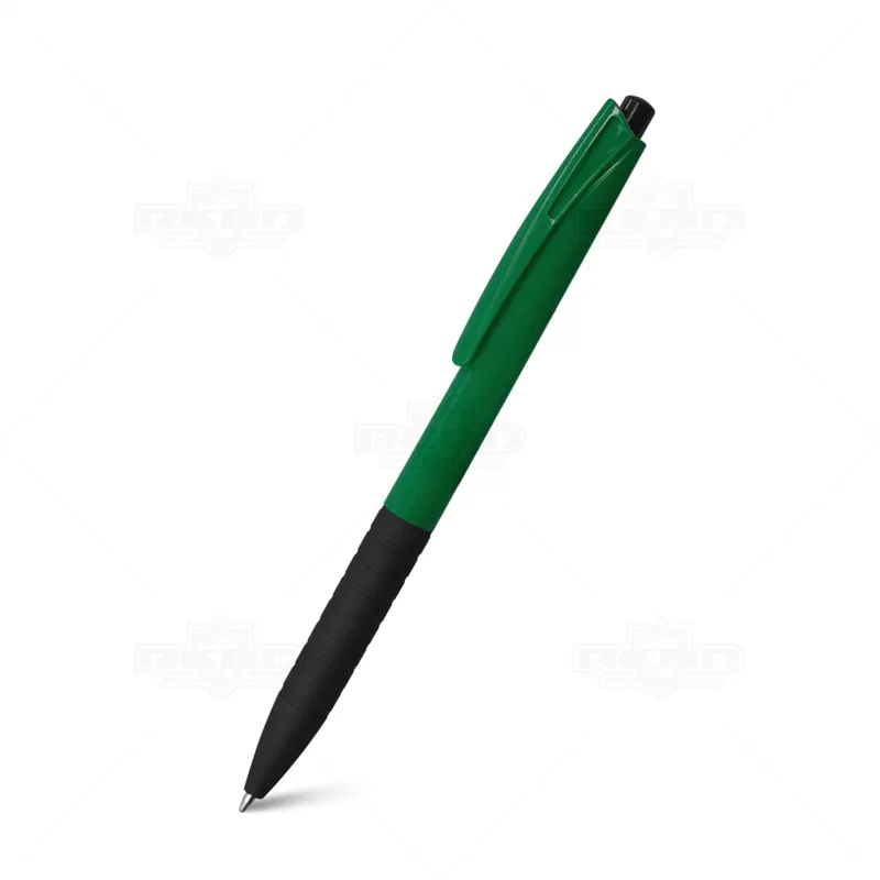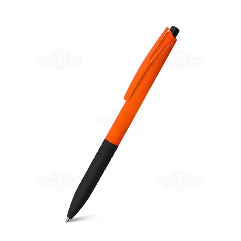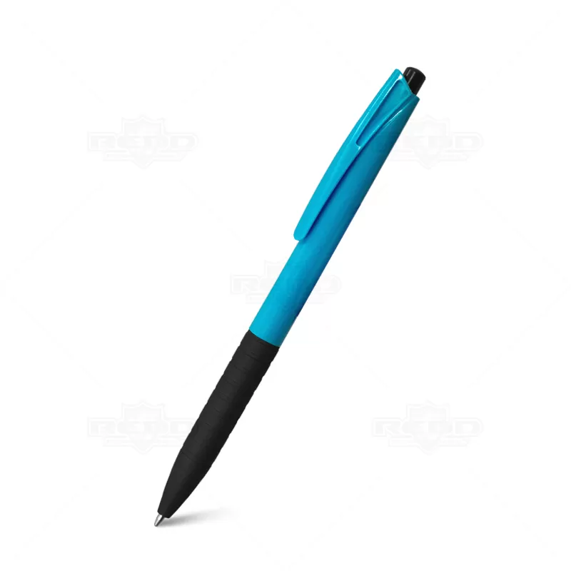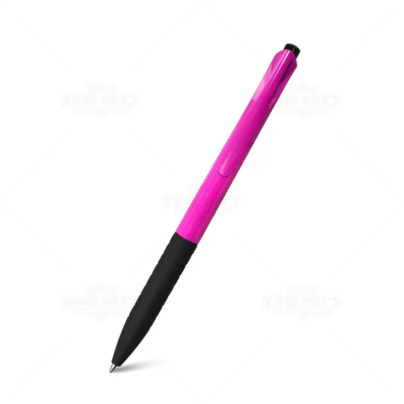 Caneta plástica personalizada com detalhe emborrachado que proporciona uma escrita macia e confortável, possui clip personalizado e sistema de acionamento da ponteira através do click. Ideal para eventos corporativos e brindes promocionais.