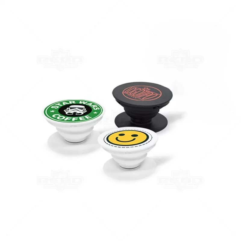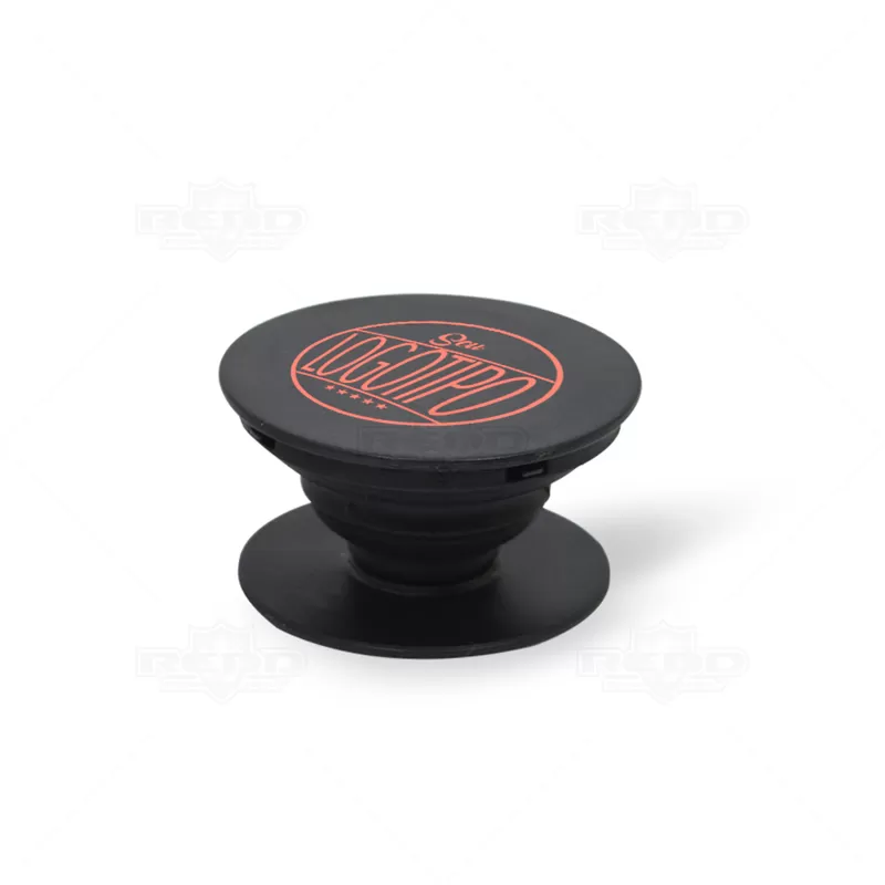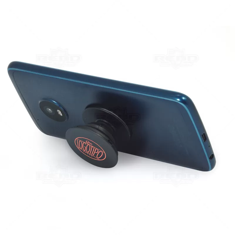 Suporte personalizado para celular popsocket com base colante de alta fixação. Possui 1 suporte para fixá-lo no verso do celular para usar com segurança entre os dedos enquanto tira fotos, selfies e até mesmo enquanto caminha, base retrátil de 2cm para usá-lo como apoio e suporte secundário para fixá-la em superfícies lisas verticalmente como suporte veicular enquanto dirige. Ideal para brindes promocionais e eventos corporativos. *Celulares não incluso ao produto.