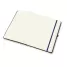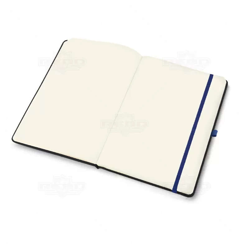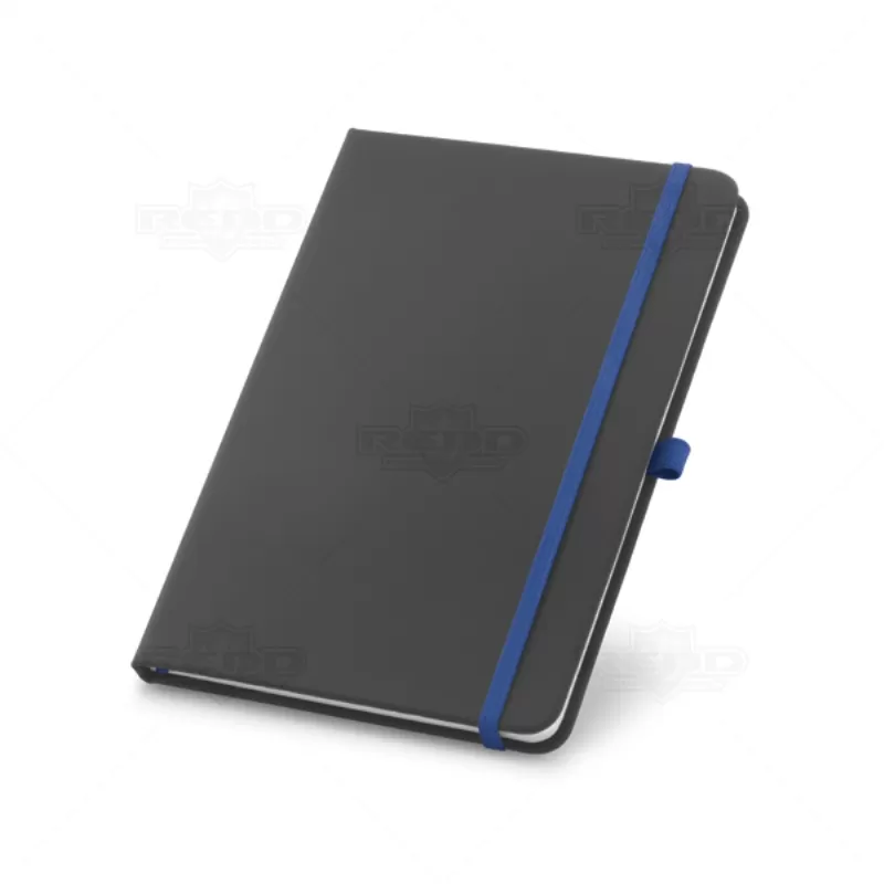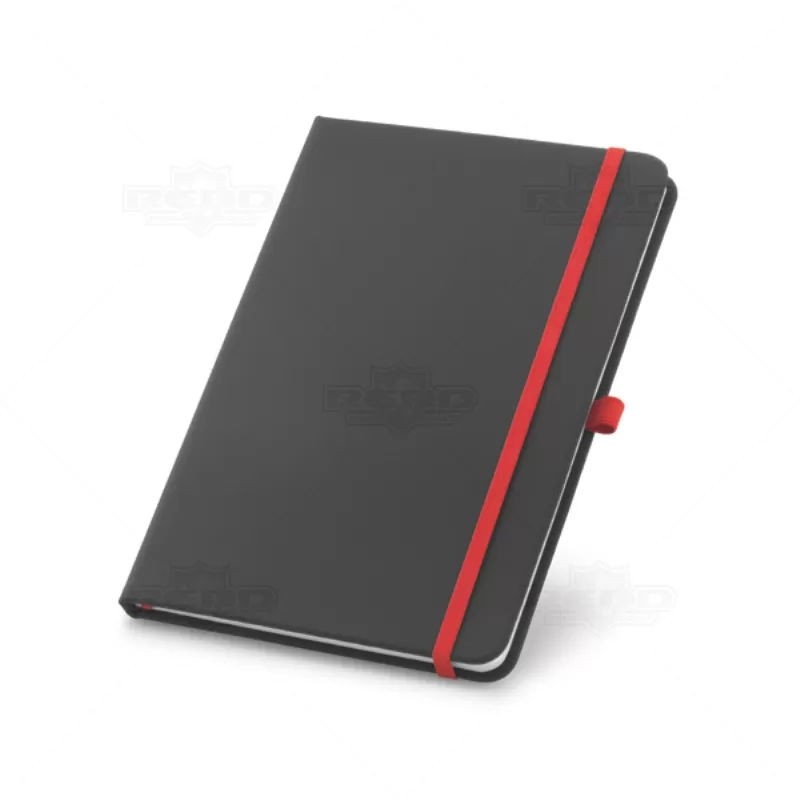 Bloco de anotações personalizado, produzido em material sintético com capa dura, elástico para fechamento e porta caneta (não incluso), possui aproximadamente 80 folhas pautadas. Ideal para brindes promocionais e eventos corporativos.