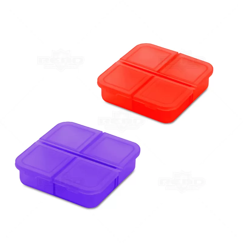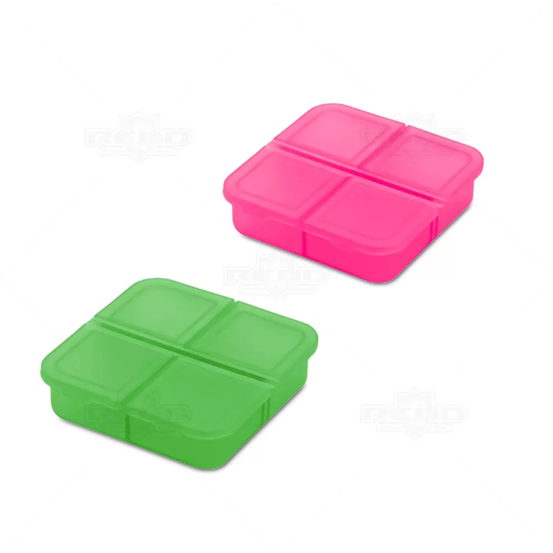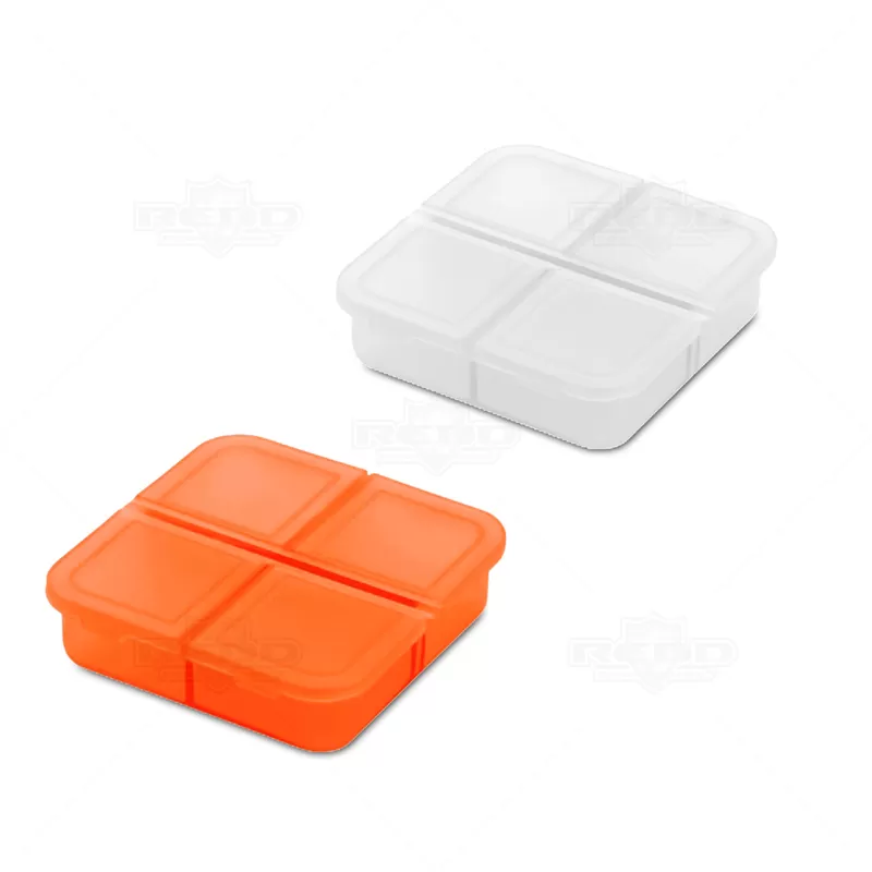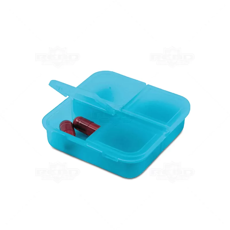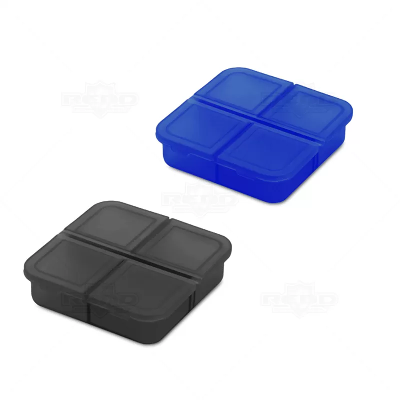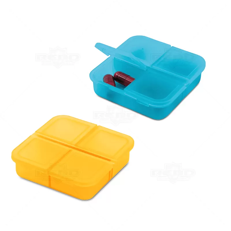 Porta comprimidos personalizado, produzido em plástico resistente e atóxico, com tampa protetora e 4 divisórias para armazenar seus remédios, vitaminas ou suplementos diários. Ideal para brindes promocionais e eventos corporativos.