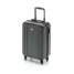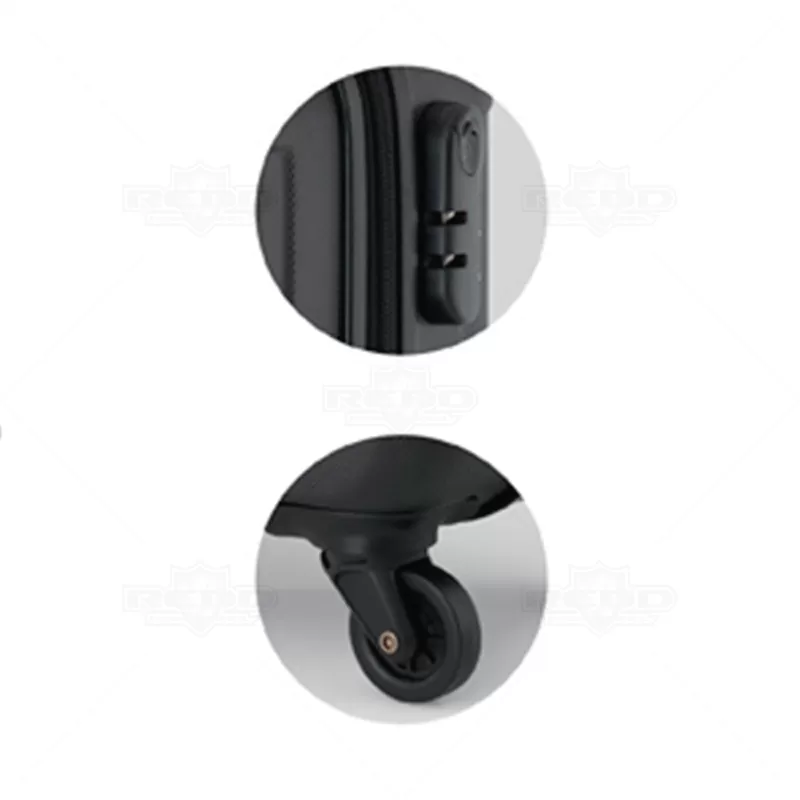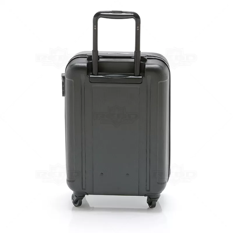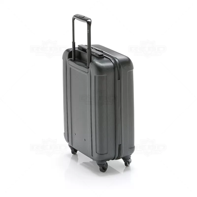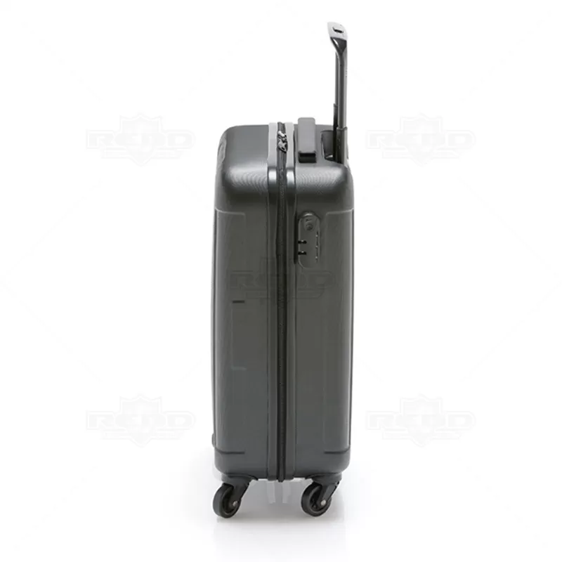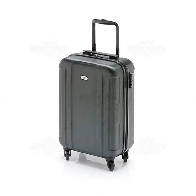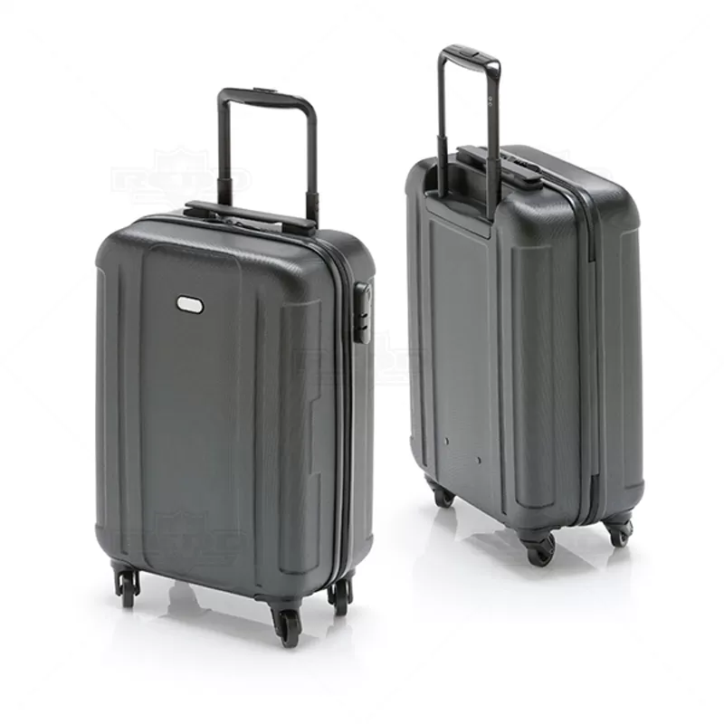 Mala de viagem executiva personalizada produzida em ABS com Interior forrado, divisória interna, 4 rodas giratórias, alça extensível em alumínio (altura da alça estendida: 500 mm). Fecho de segurança com senha e placa metálica removível com imã para gravação.