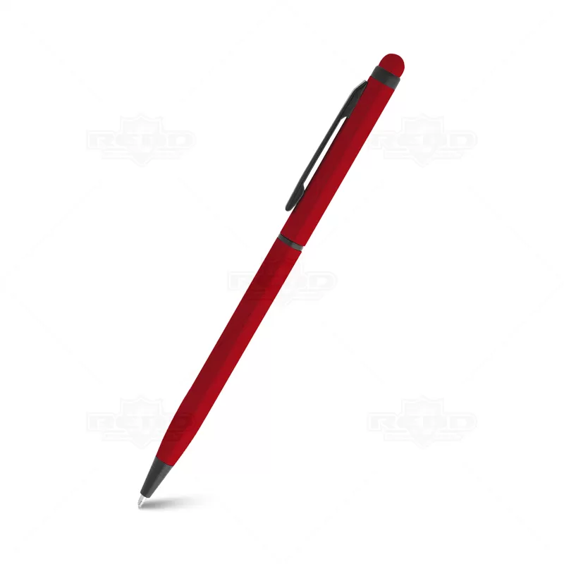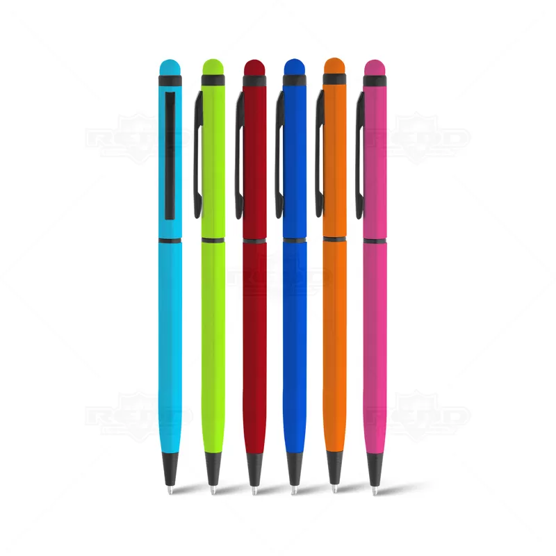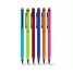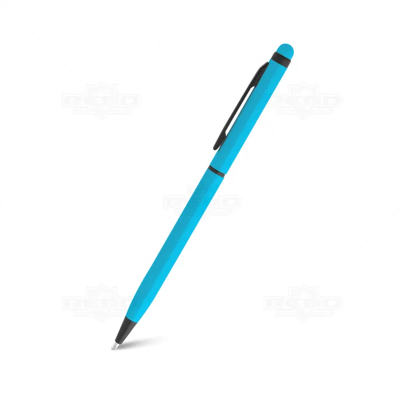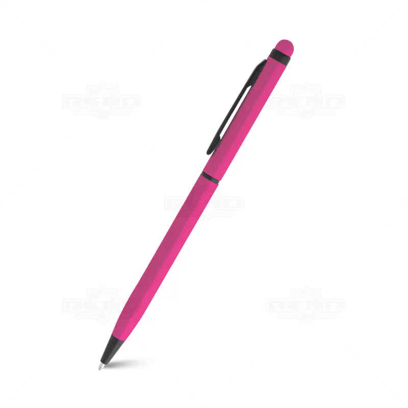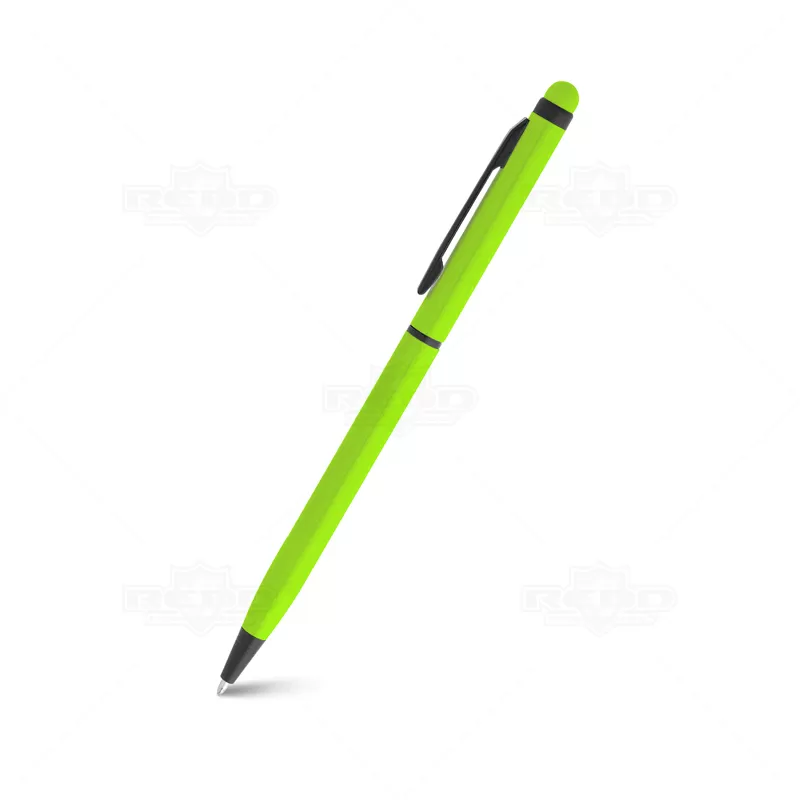 Caneta de metal personalizada, modelo Slim, produzida em alumínio, com acabamento "neon", dando as peças cores vibrantes e alegres, esferográfica azul com acionamento giratório (twist) e ponteira touch para uso em tablets e smartphones. Ideal para brindes personalizados e eventos corporativos.