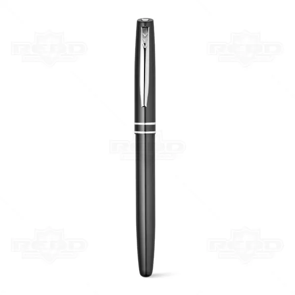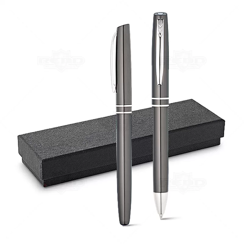 Conjunto personalizado com caneta esferográfica na cor azul e caneta roller de metal. Possui uma escrita macia e confortável com um estojo elegante em cartonagem black. Ideal para brindes promocionais e eventos corporativos. *Tamanho do Estojo: 175 x 55 x 25 mm