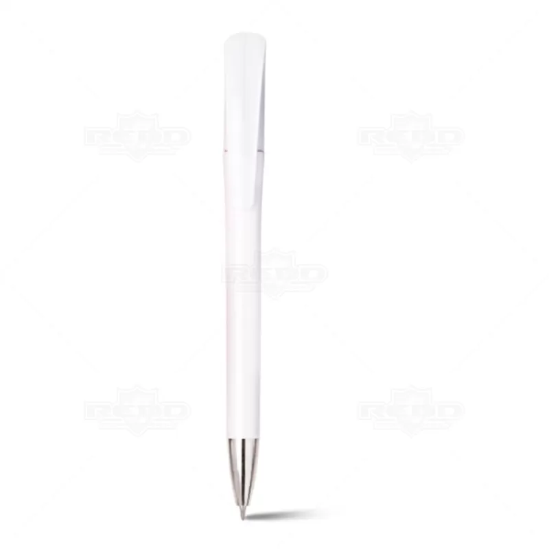 Caneta plástica personalizada produzida em ABS em um design inovador com acabamento brilhoso, possui esferográfica na cor azul que é exibida e recolhida através do mecanismo de giro e clip curvado diferenciado. Ideal para eventos corporativos e brindes promocionais.