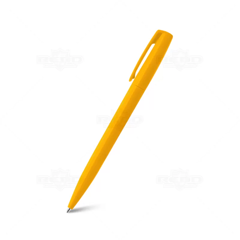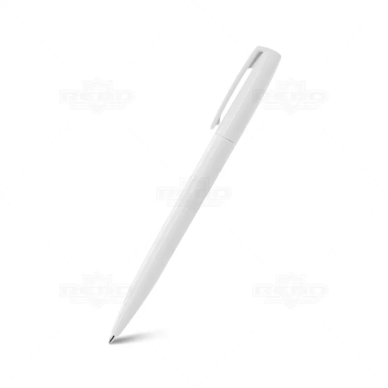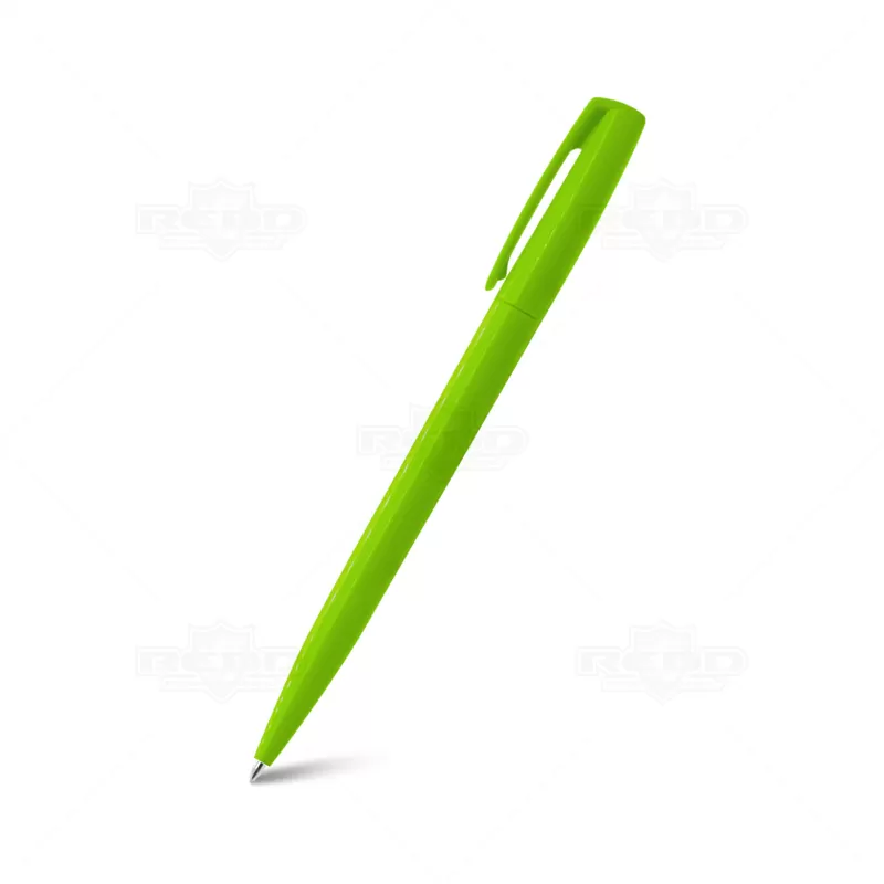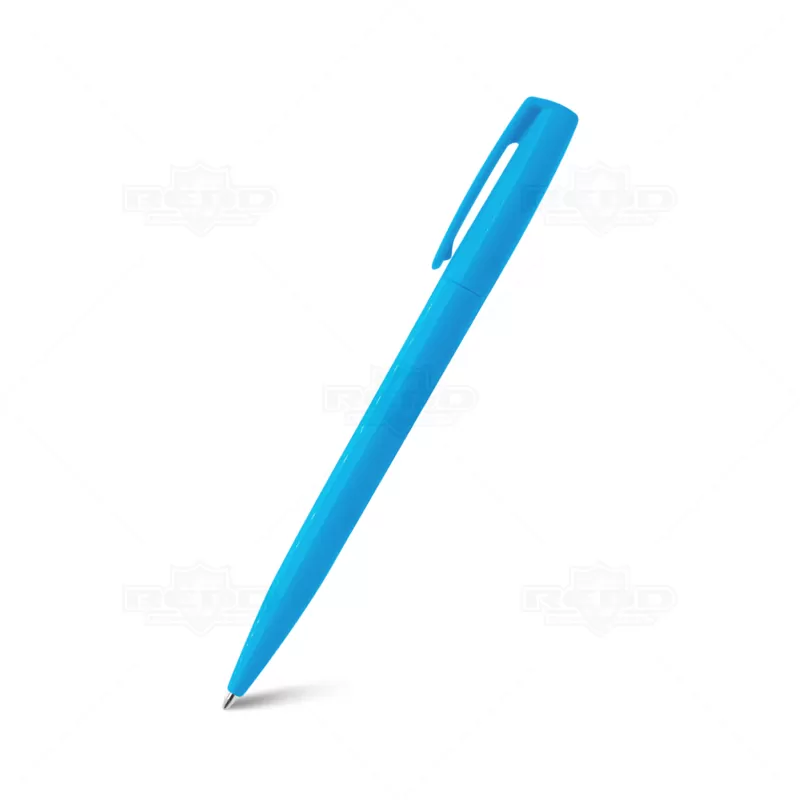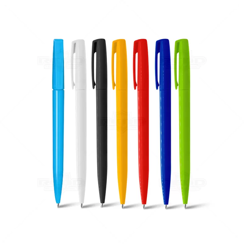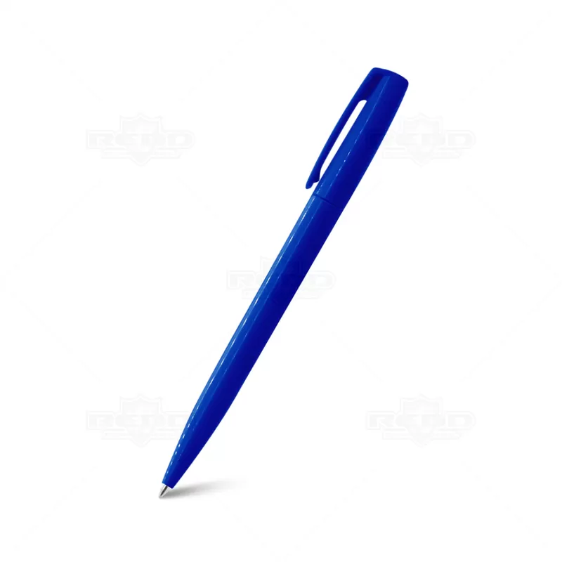 Caneta plástica produzida em ABS, esferográfica na cor azul que é exibida e recolhida através do mecanismo giratório. Ideal para eventos corporativos e brindes promocionais.