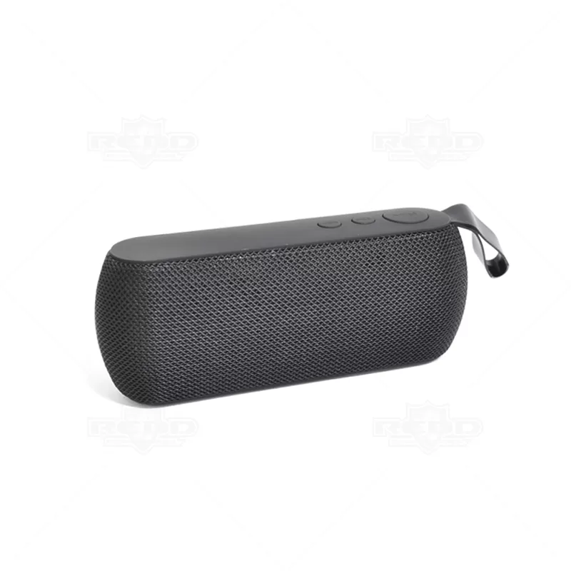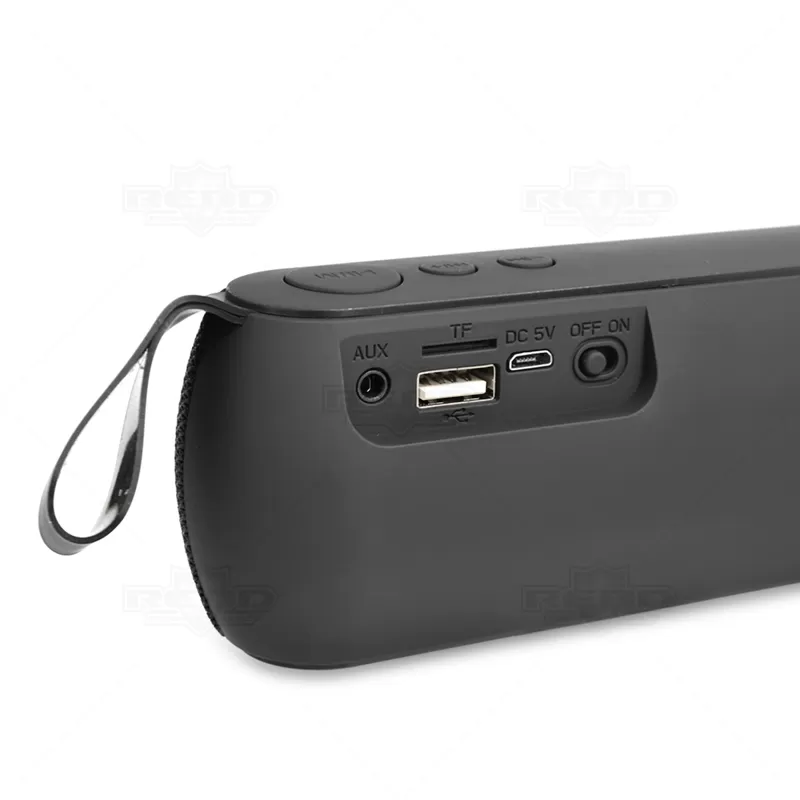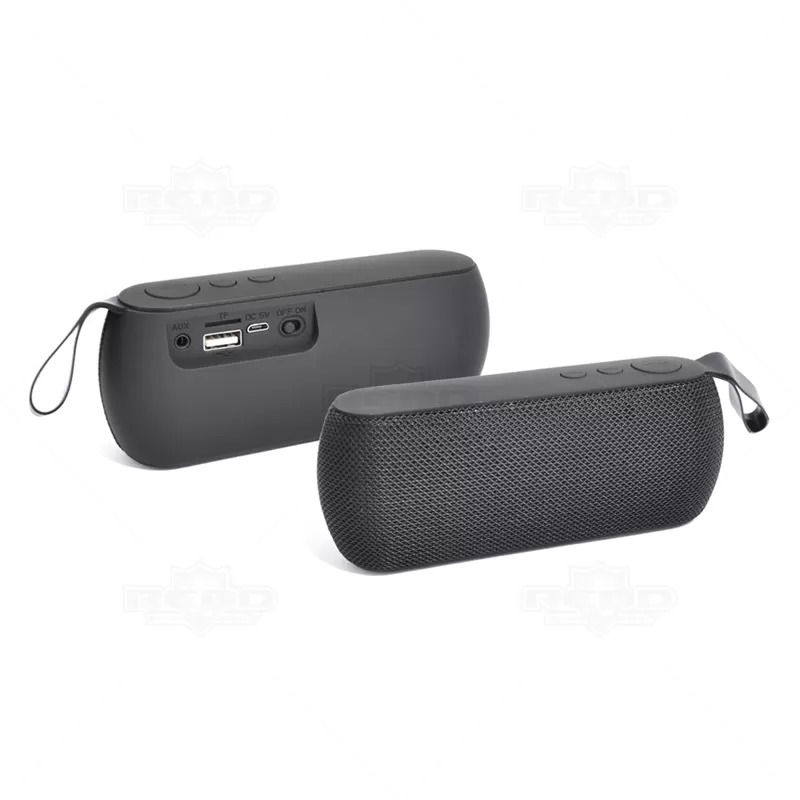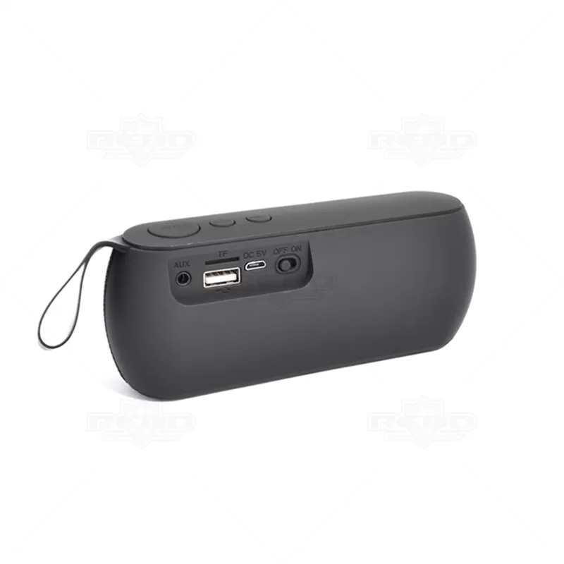 Caixa de som personalizada com acabamento emborrachado, possui entrada auxiliar P2, entrada TF (Micro SD), entrada USB, entrada DC 5V e botão para ligar e desligar. Bluetooth, USB (pen drive), rádio (neste modo é necessário o cabo como antena na entrada), DC 5V e entrada de áudio auxiliar P2. Distância de alcance aproximadamente 10metros, carga de bateria de 2 a 3 horas aproximadamente, bateria 1200mAh, acompanha cabo USB e cabo auxiliar P2. Ideal para brindes corporativos e eventos promocionais.