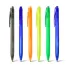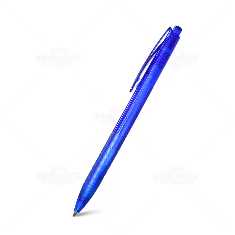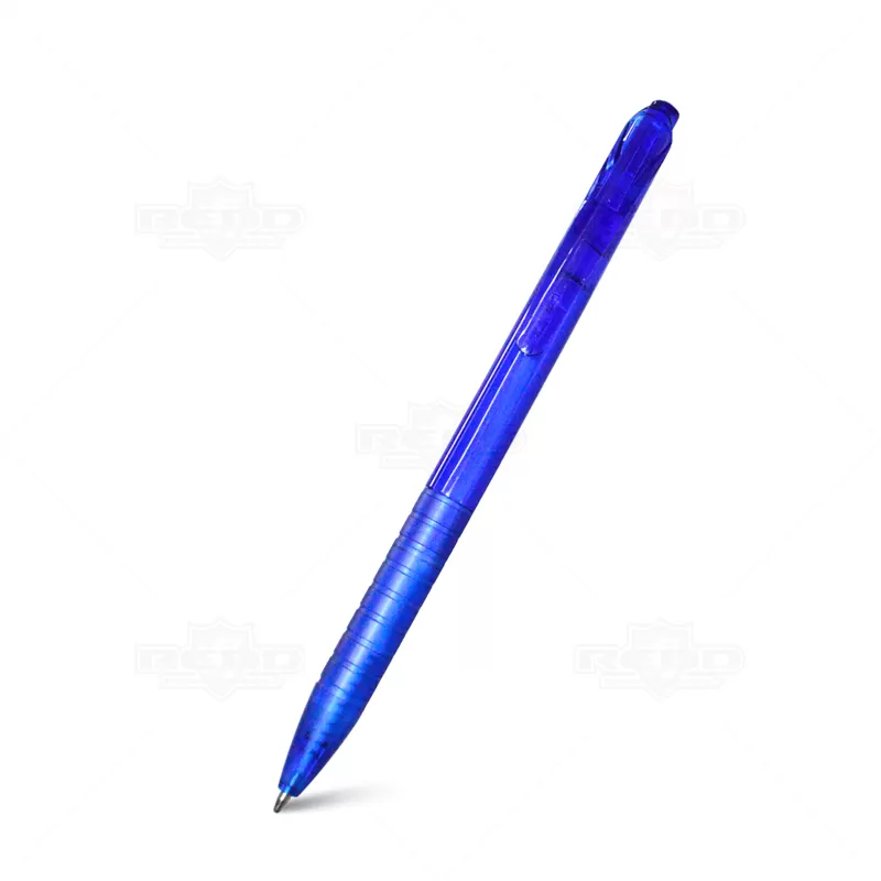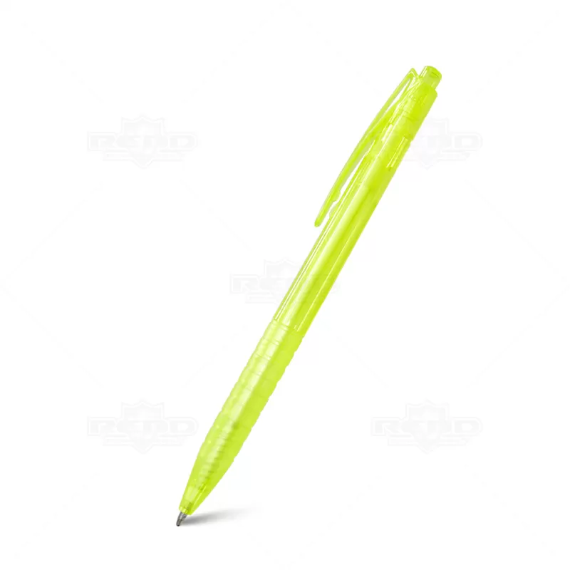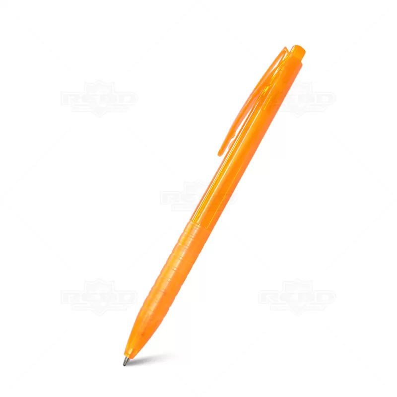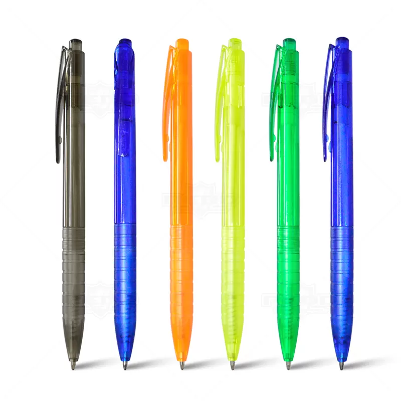 Caneta plástica personalizada produzida em plástico translúcido com clip injetado e acionamento da ponteira no click. Ideal para brindes promocionais e eventos corporativos.