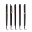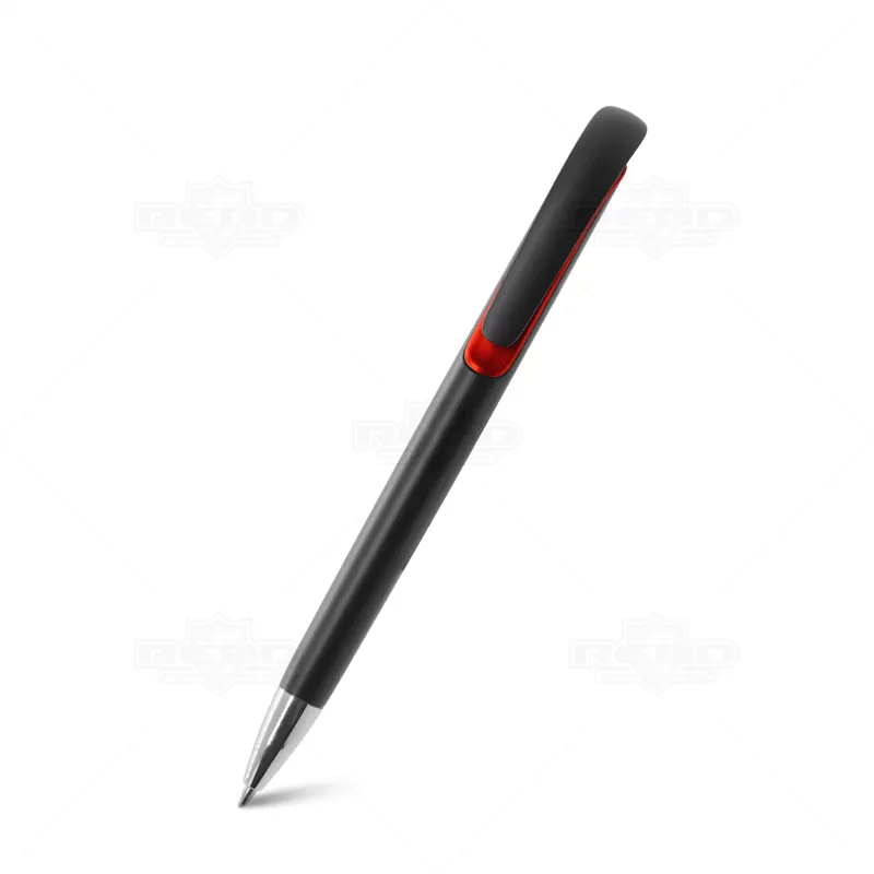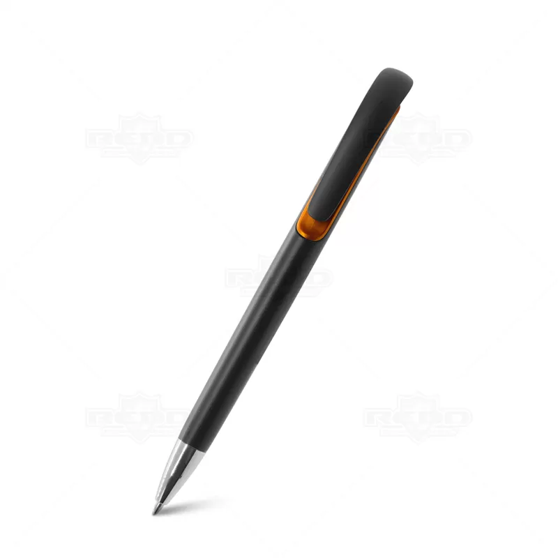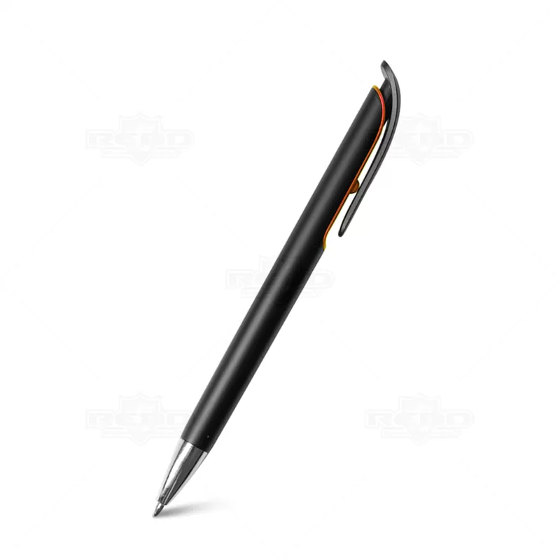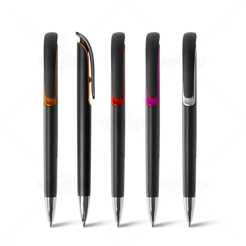 Caneta plástica personalizada com design inovador, possui detalhe colorido, clip plástico, ponteira de metal e acionamento da escrita por click. Ideal para brindes promocionais e eventos corporativos.